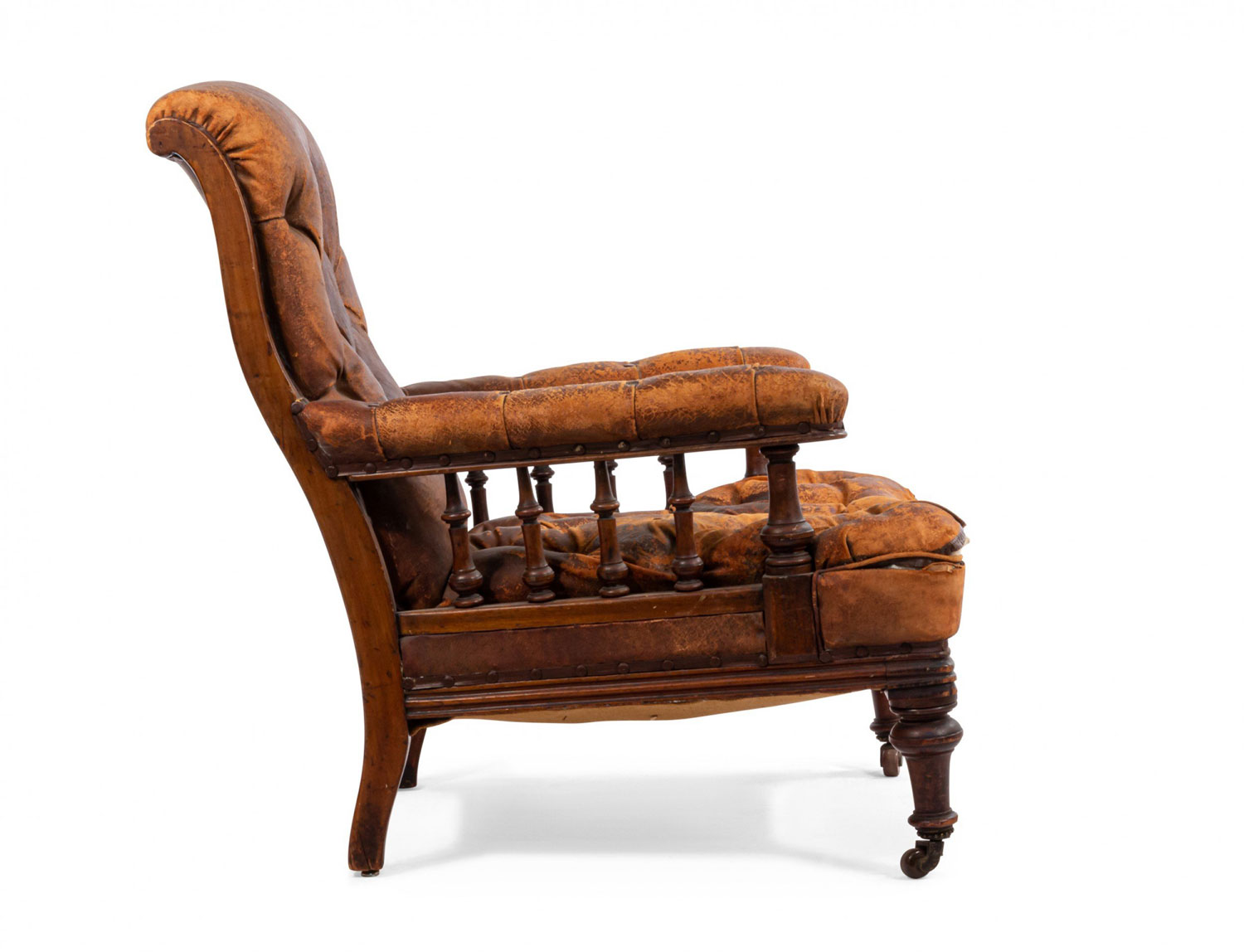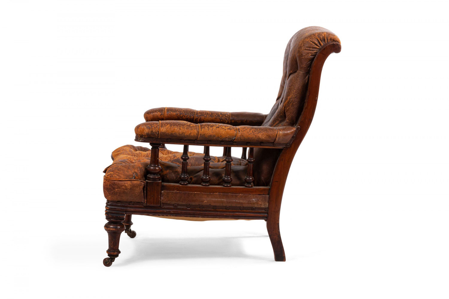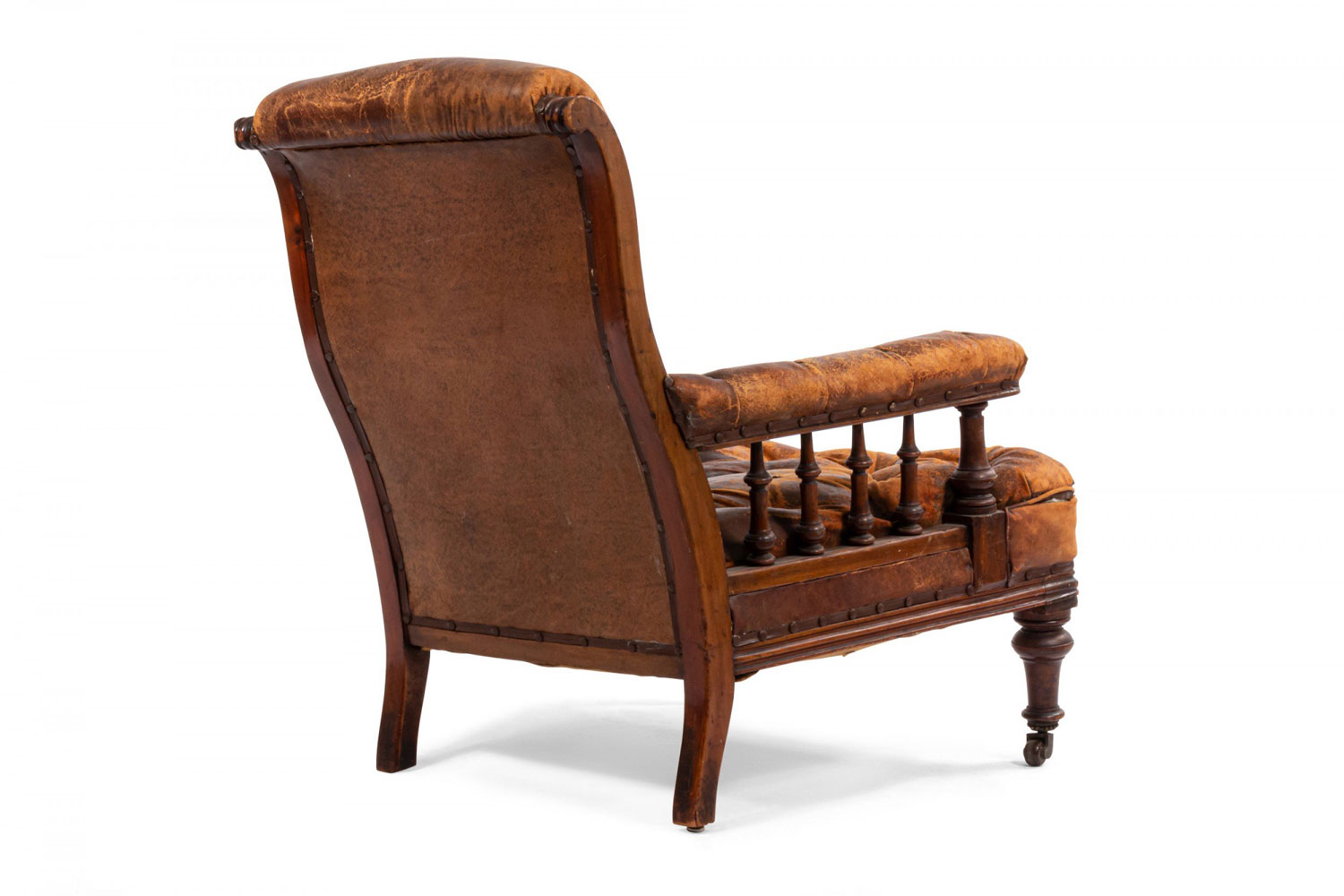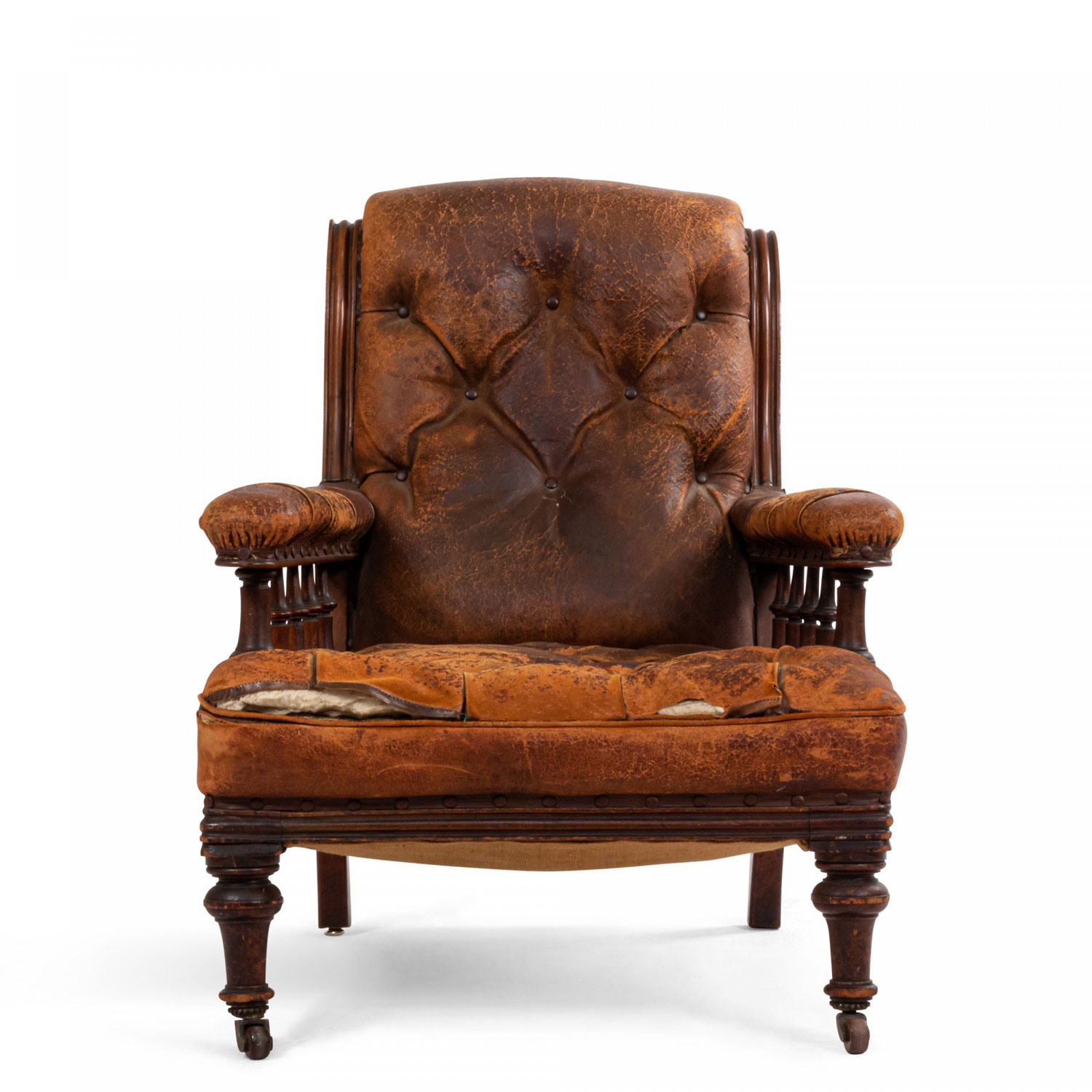 Style: English Materials & Techniques: Mahogany, leather, tufted Category: Seating Condition: Antique condition, leather is cracking/aged.
