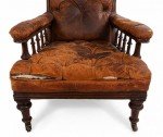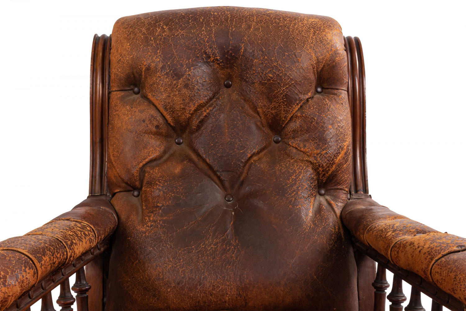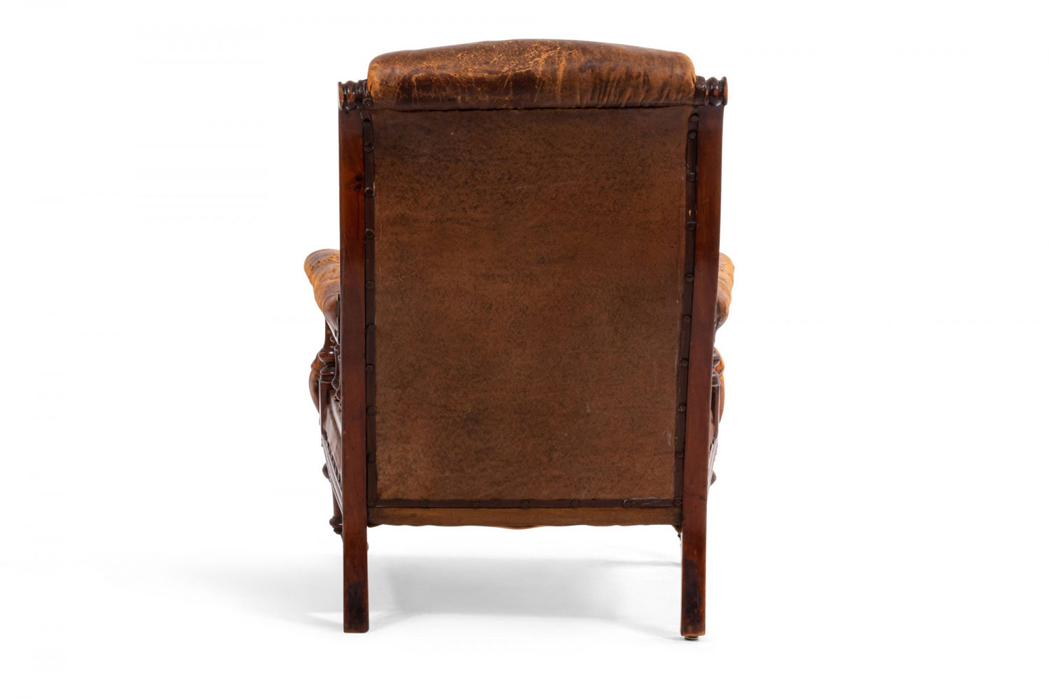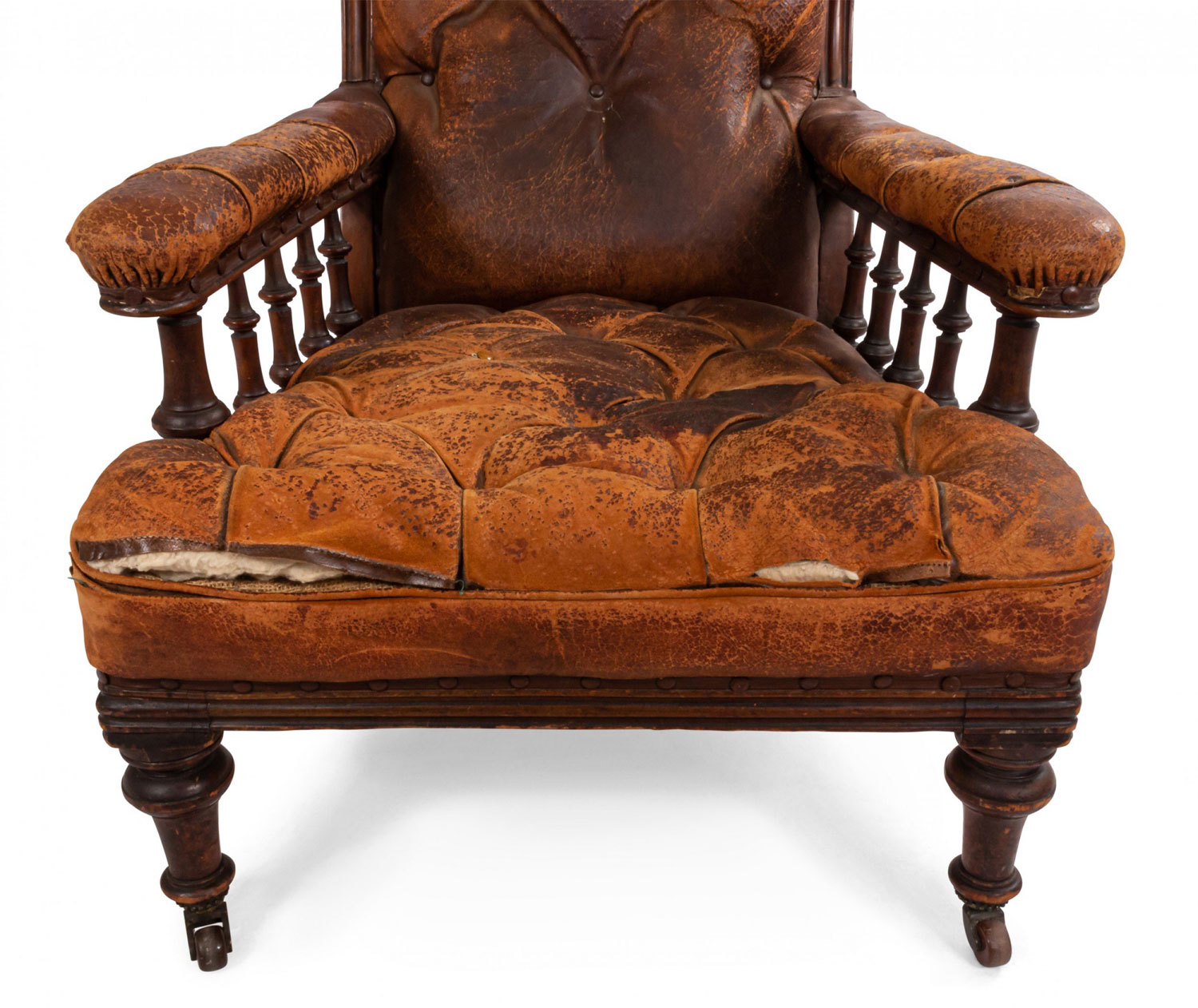 Style: English Materials & Techniques: Mahogany, leather, tufted Category: Seating Condition: Antique condition, leather is cracking/aged.