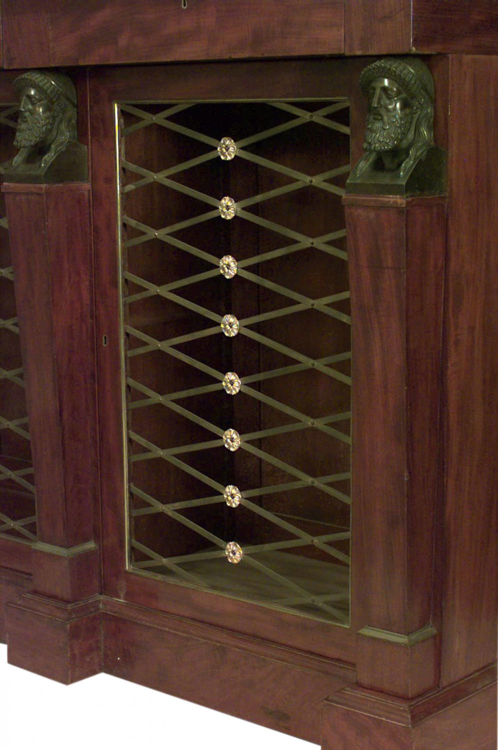 English Regency mahogany bookcase with 8 brass lattice doors and bronze classical Grecian heads..