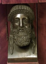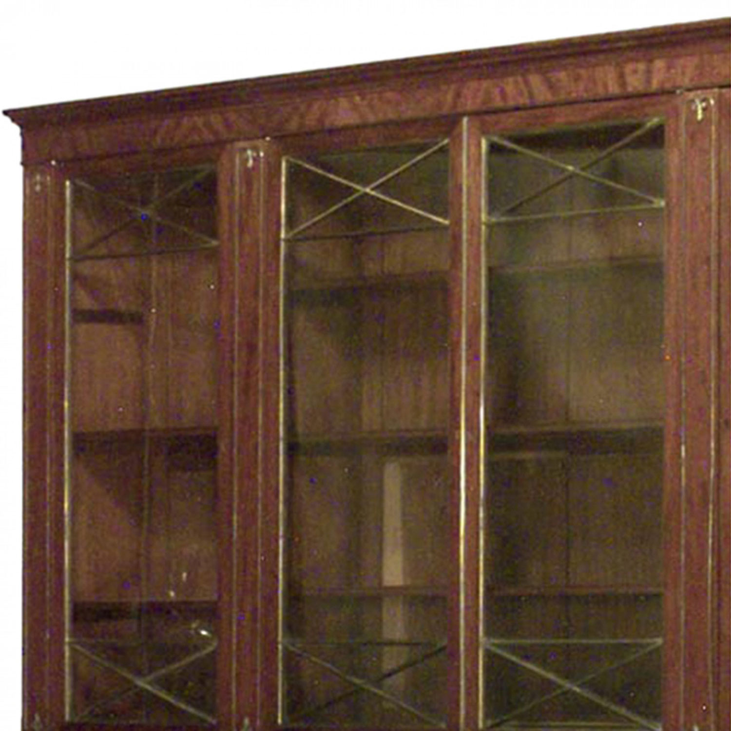 English Regency mahogany bookcase with 8 brass lattice doors and bronze classical Grecian heads.