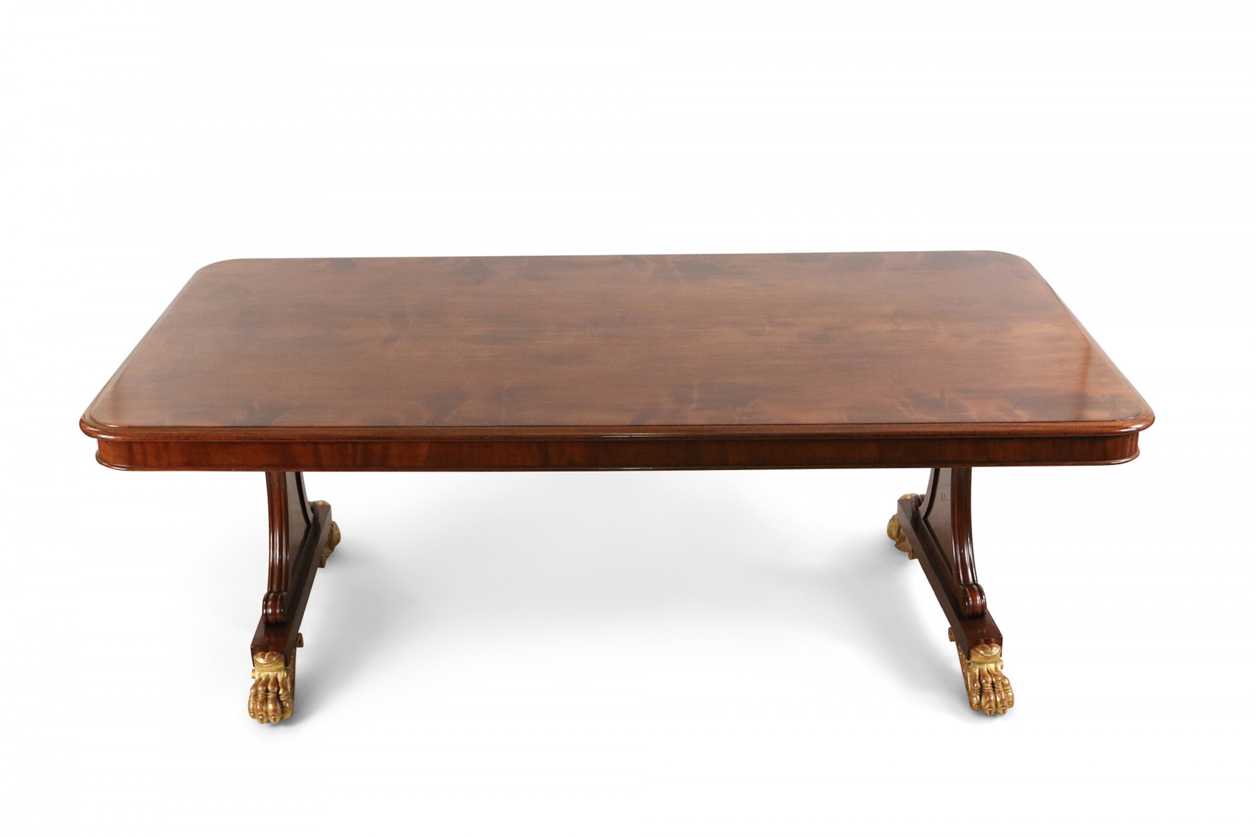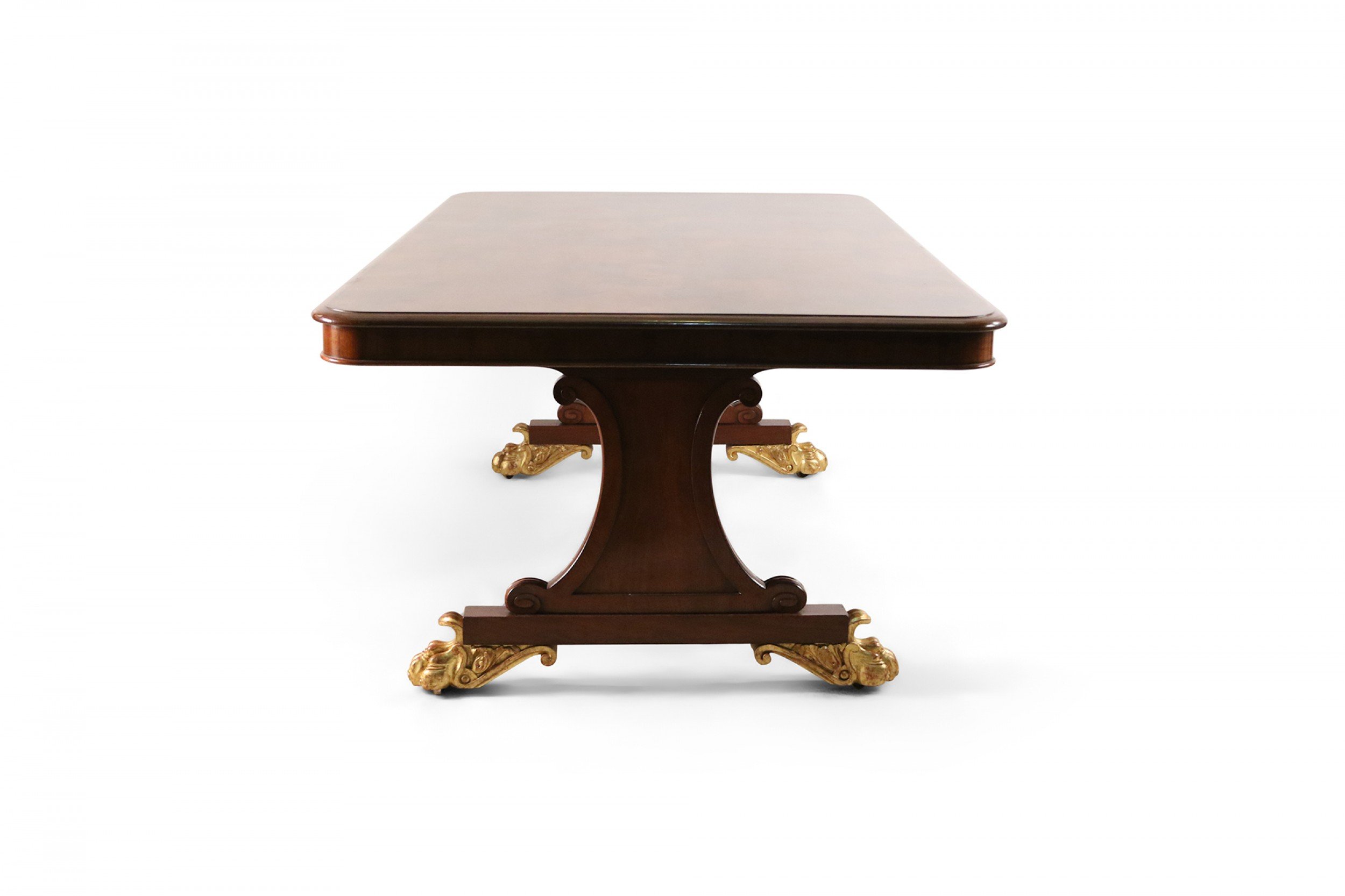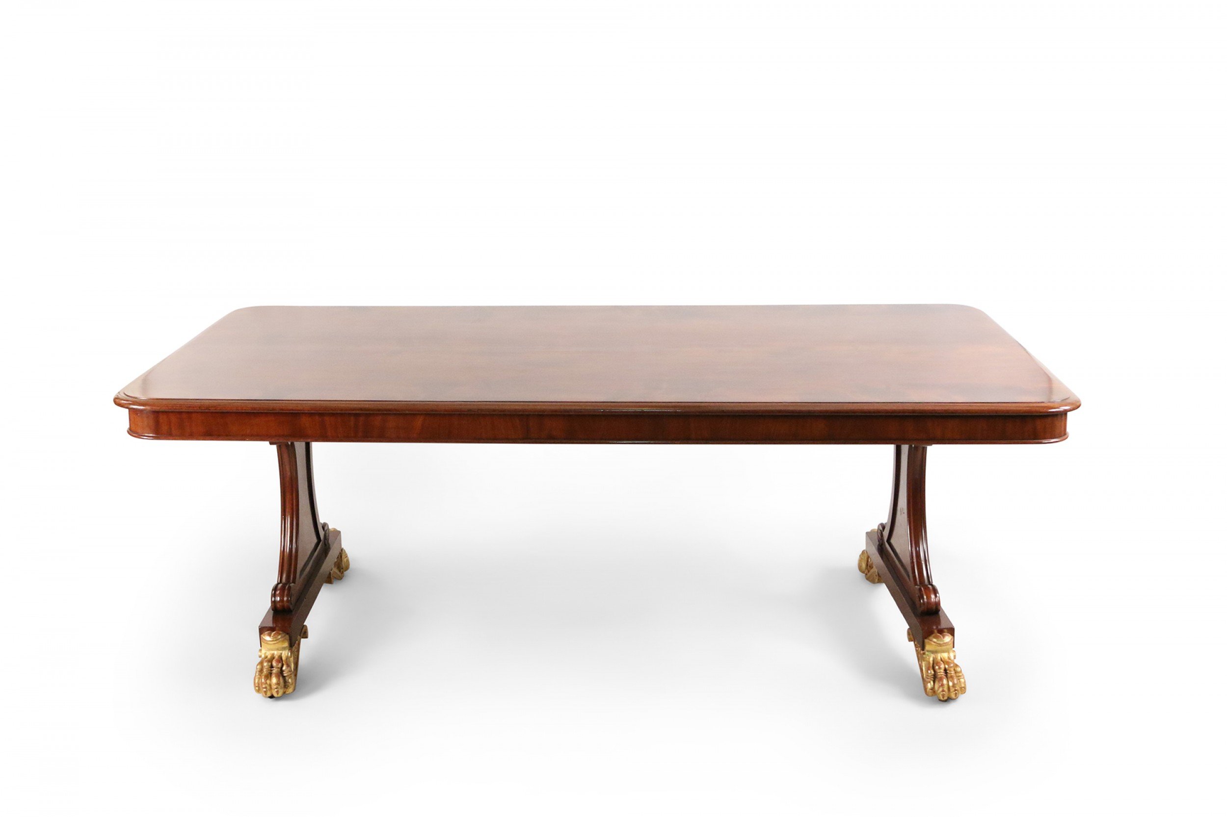 English Regency mahogany double pedestal rectangular dining table with gilt claw feet..