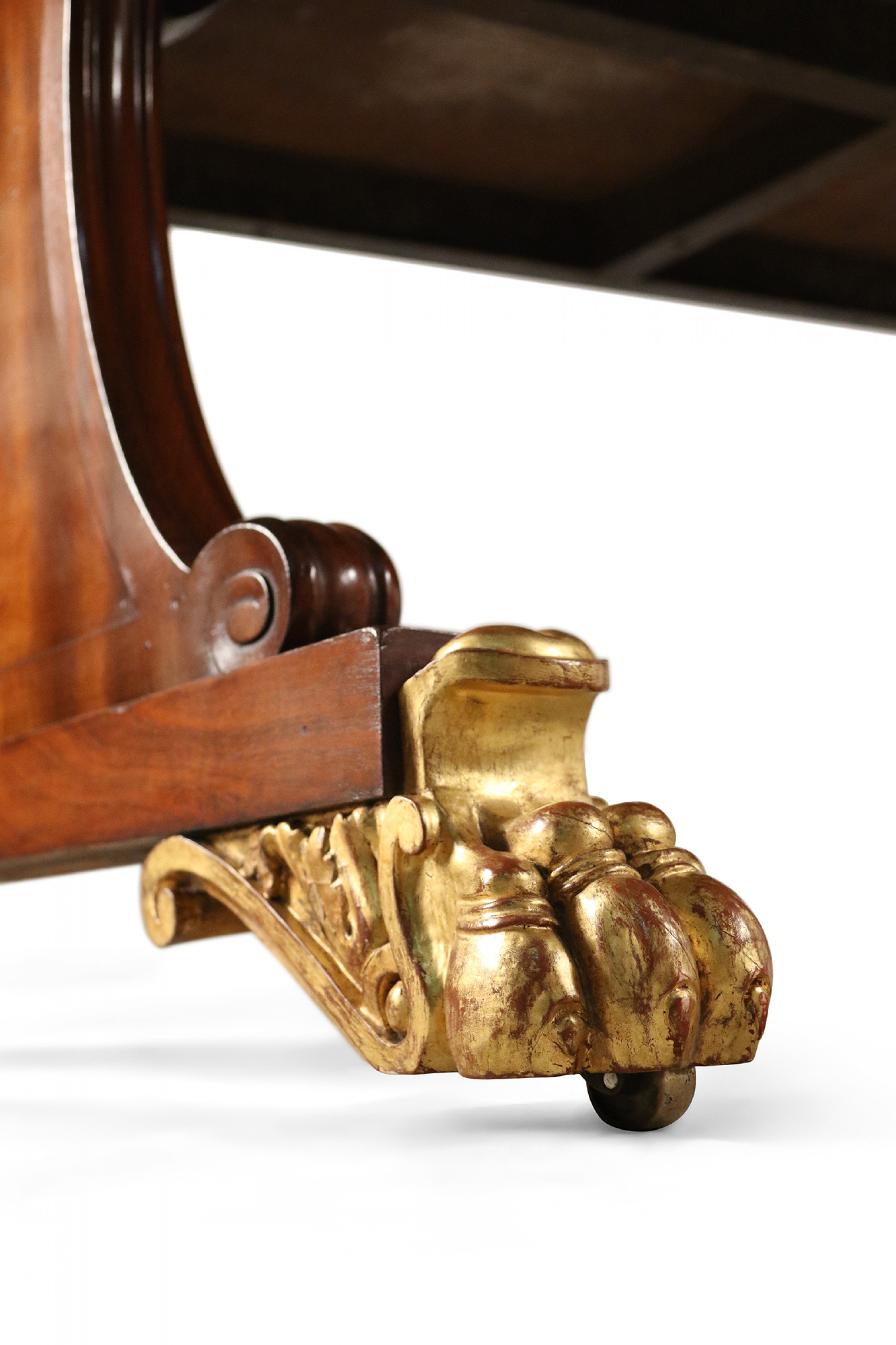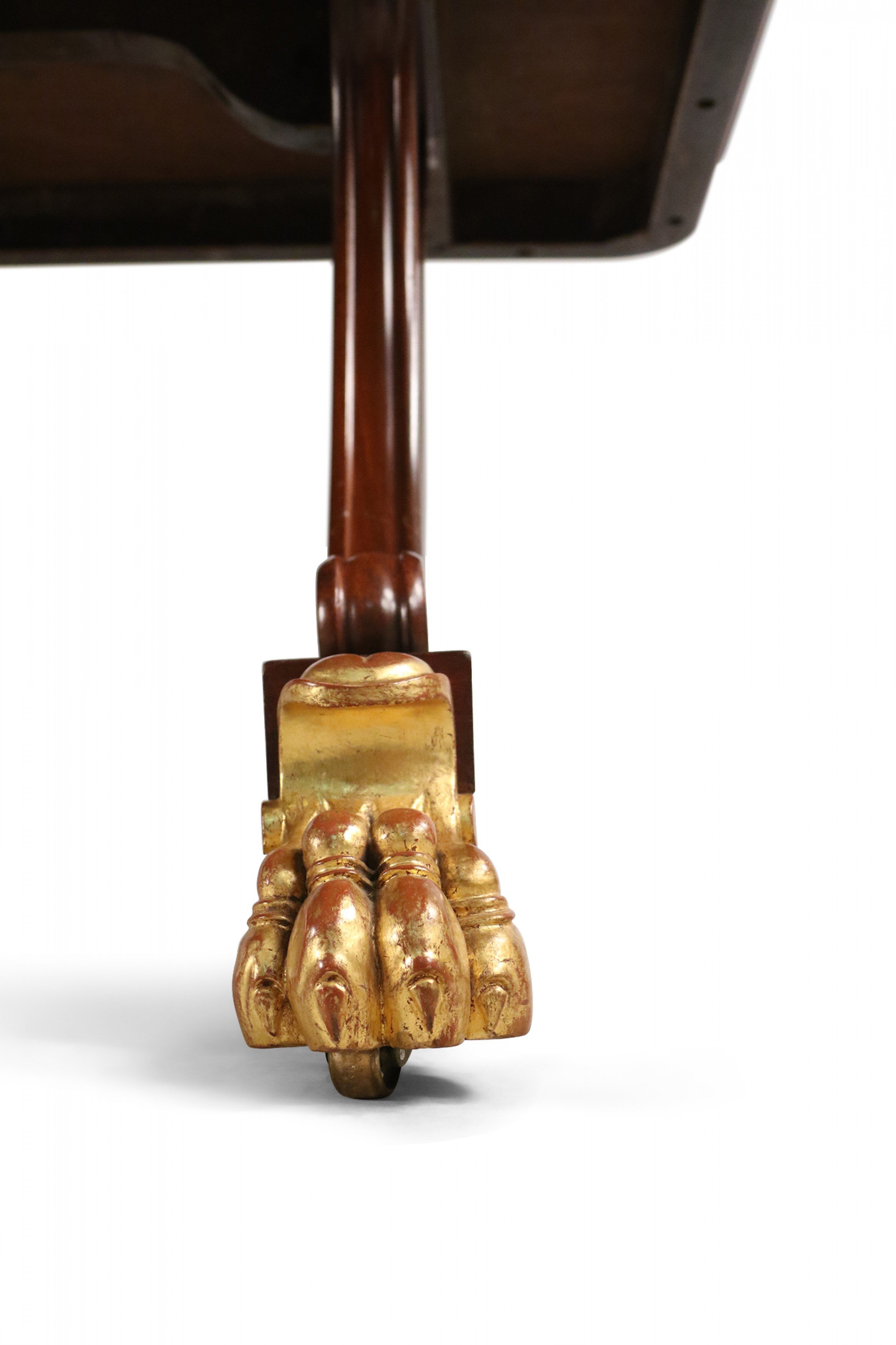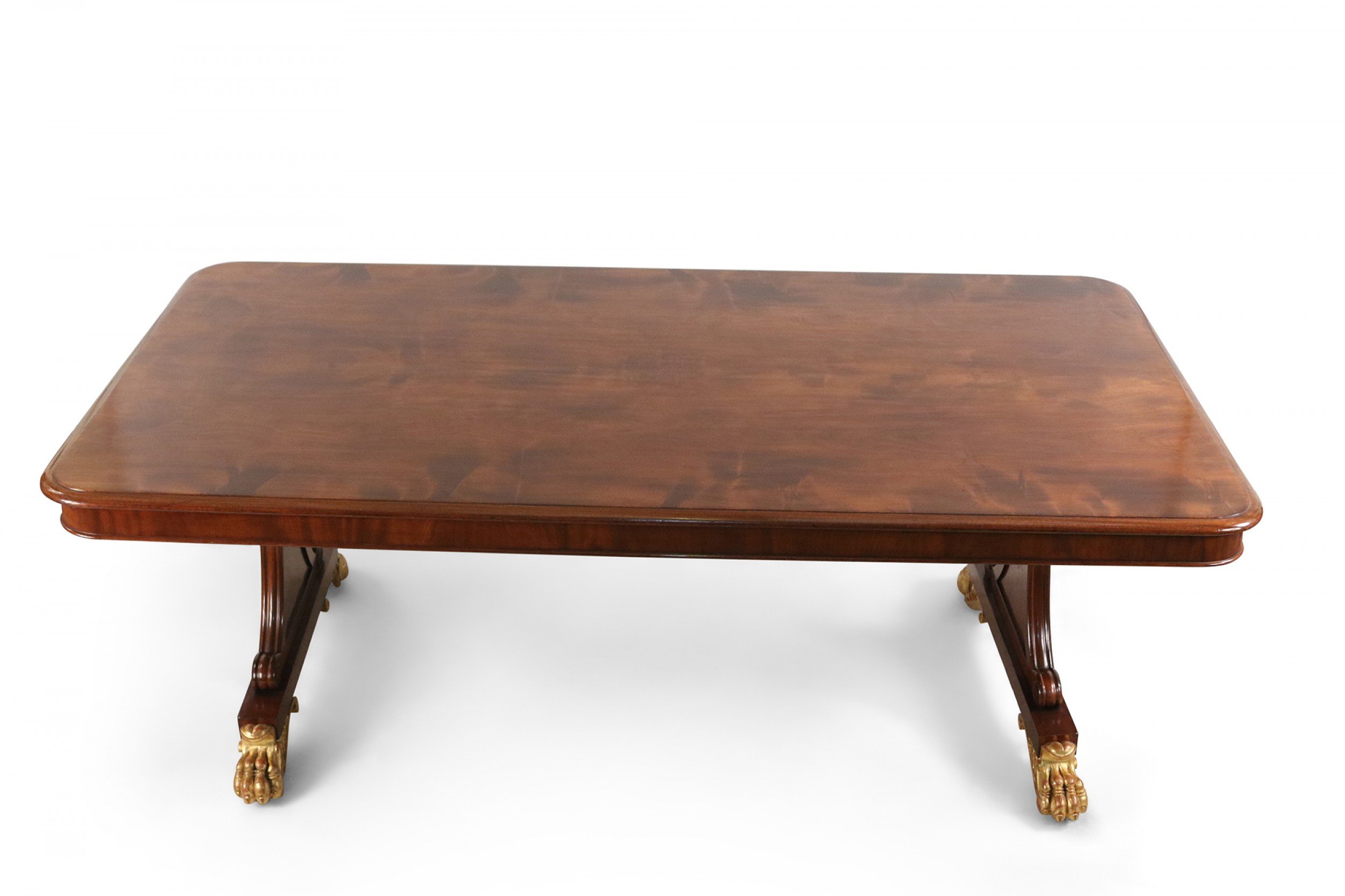 English Regency mahogany double pedestal rectangular dining table with gilt claw feet..
