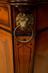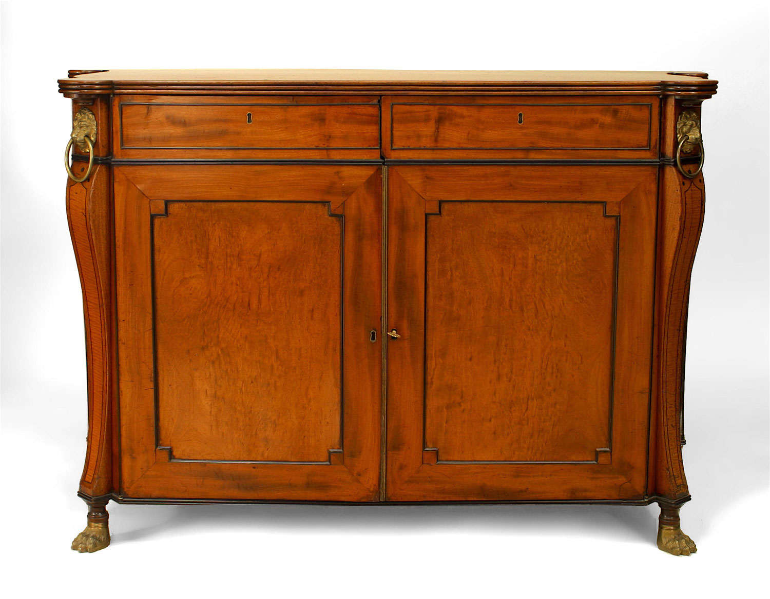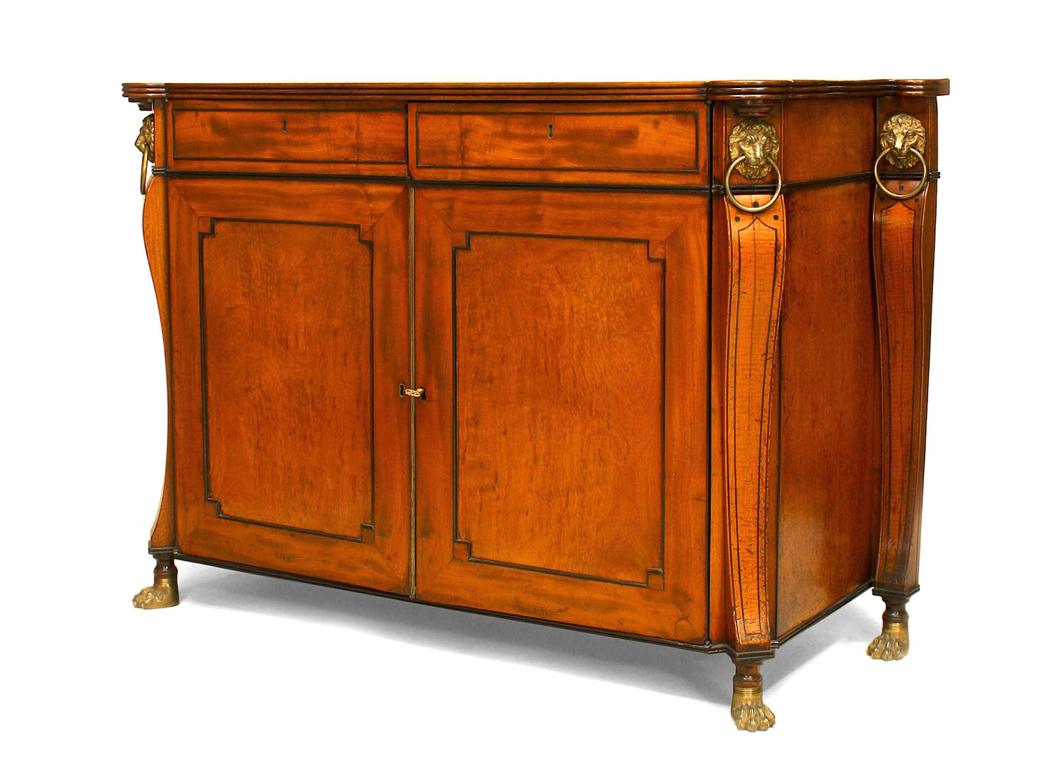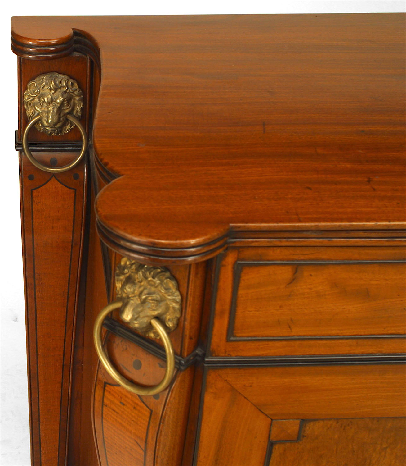 English Regency mahogany and ebonized trimmed commode with flaired back sides and 2 drawers over 2 large doors trimmed with bronze lion heads and claw feet.