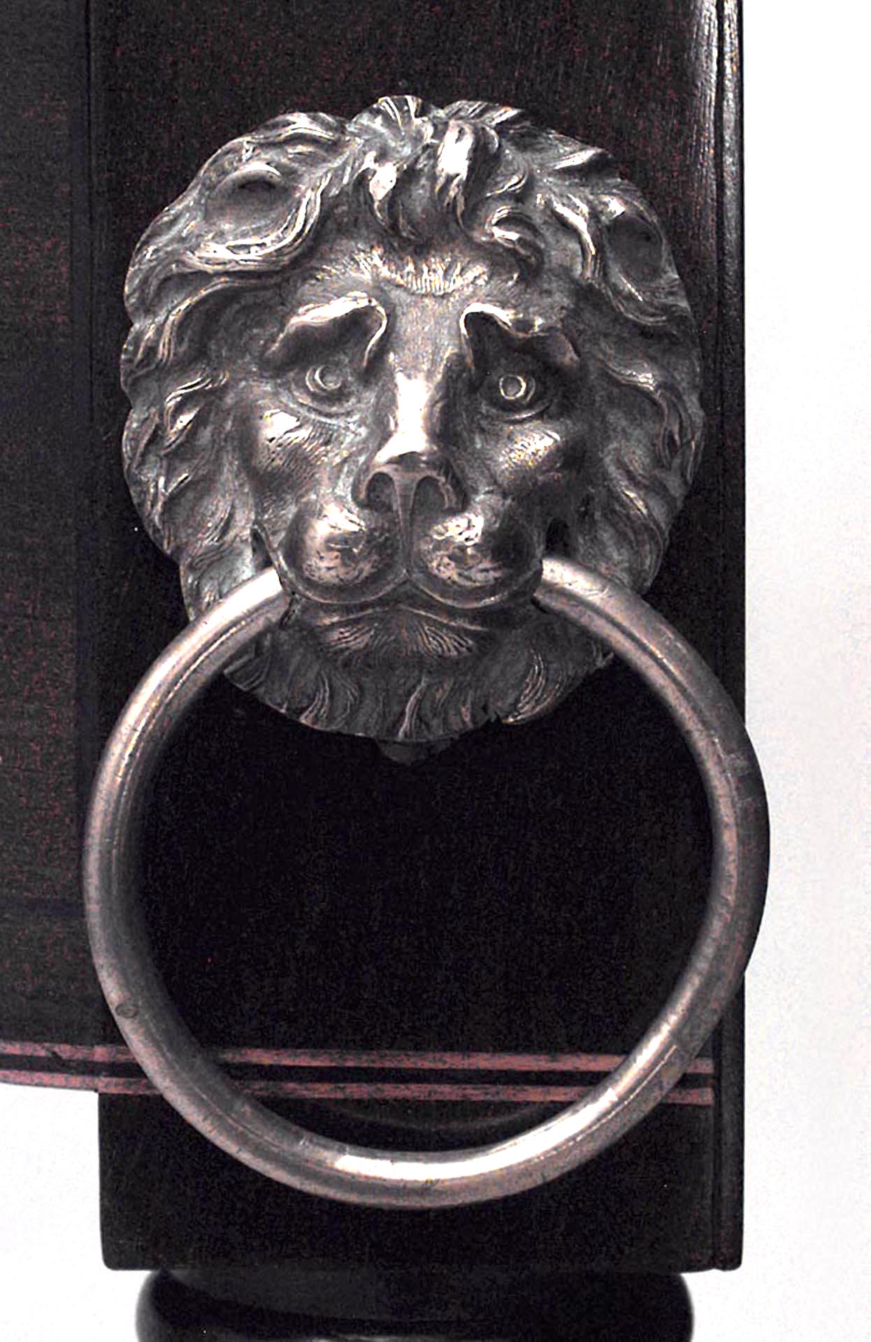 English Regency (Likely Irish, Early 19th Century) banded inlaid mahogany console table with concave front above lion headed reeded turned legs with paw feet.