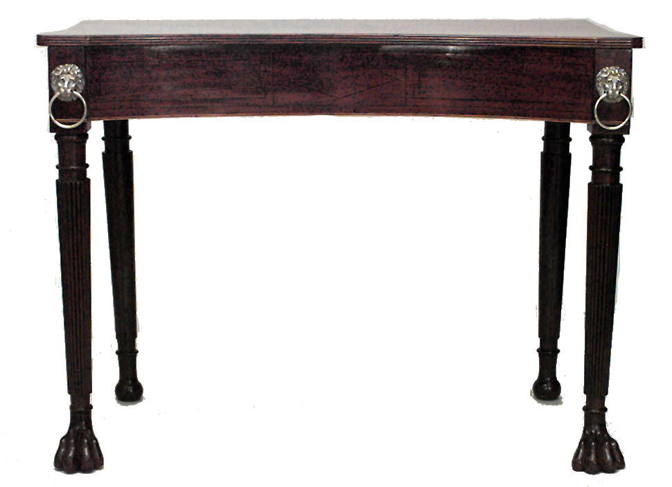 English Regency (Likely Irish, Early 19th Century) banded inlaid mahogany console table with concave front above lion headed reeded turned legs with paw feet..
