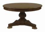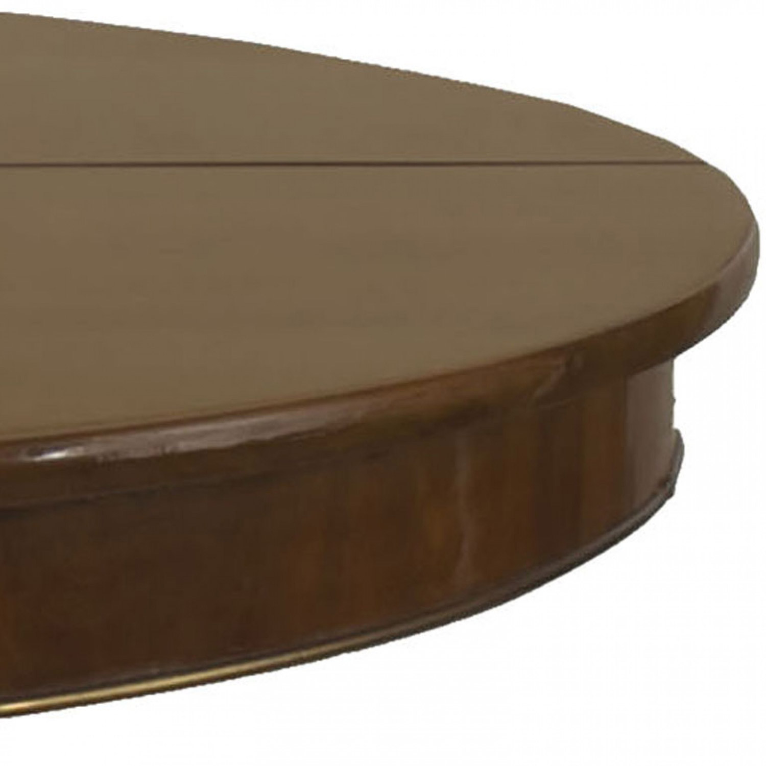 2 English Regency-style mahogany round (extension) dining tables with a tripartite carved scroll design pedestal and brass trim and replaced claw feet. (Each table has 2-30" leaves and 2-24" leaves; approx. 11' each) (2-PRICED EACH)