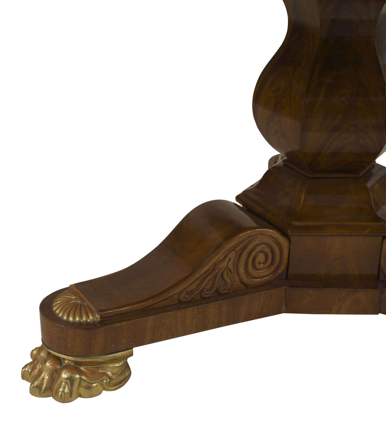 2 English Regency-style mahogany round (extension) dining tables with a tripartite carved scroll design pedestal and brass trim and replaced claw feet. (Each table has 2-30" leaves and 2-24" leaves; approx. 11' each) (2-PRICED EACH).
