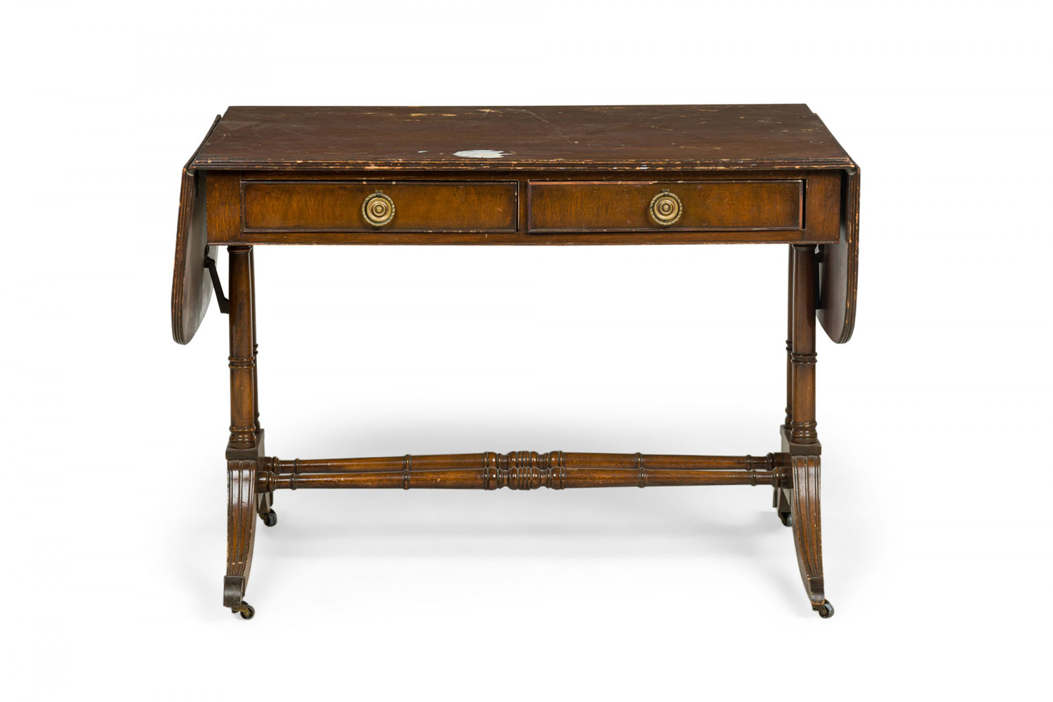 English Regency (19th Century) mahogany sofa / console table with two drawers with brass ring drawer pulls, and a drop leaf on either side, resting on two wide legs joined by a two bar stretcher.