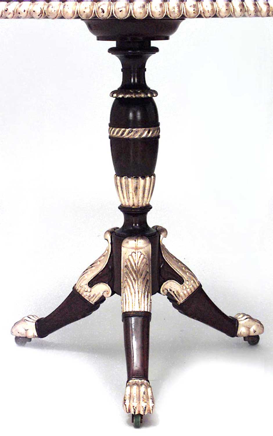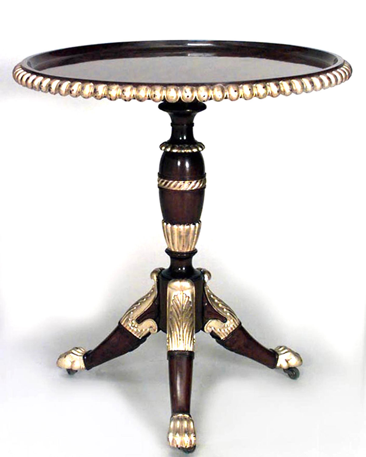 English Regency-style (19th Century) mahogany and gilt trimmed scalloped edge round end table with 3 legs and pedestal base..