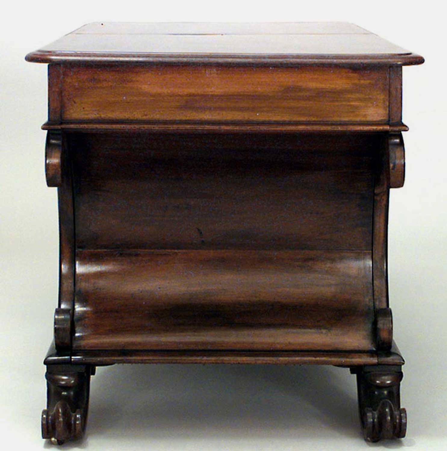 English Regency mahogany metamorphic library table/steps with hinged top & lion finial on a scrolled base. (with registry tag for J. Brodey, Bristol, dated March 12, 1851)