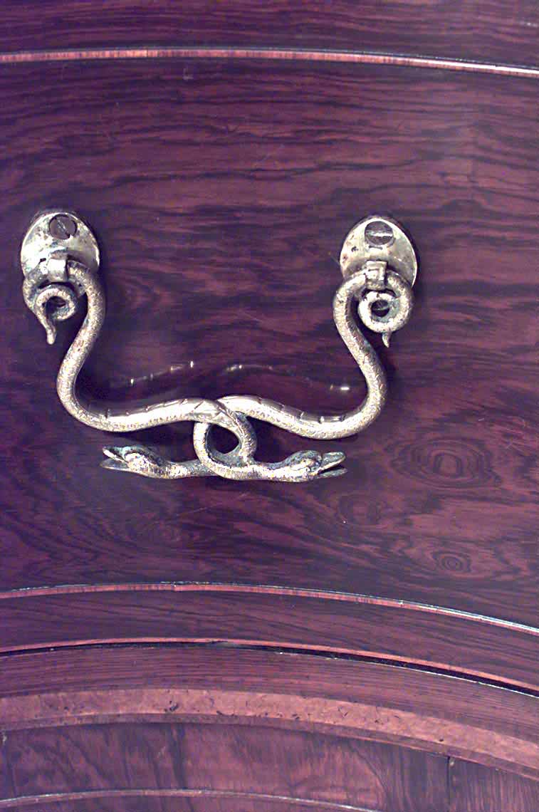 English Regency rosewood and satinwood inlaid double pedestal sideboard with a back rail and large cellarette drawers having brass snake handles. (DUVEEN BROS label in drawer)