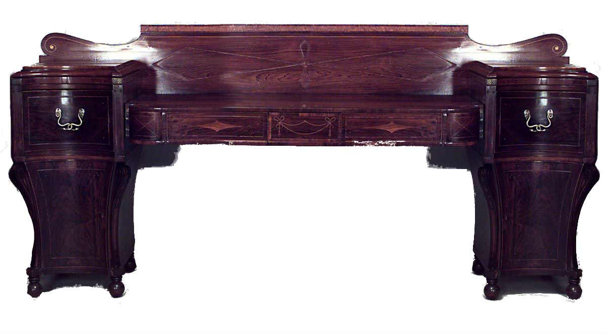 English Regency rosewood and satinwood inlaid double pedestal sideboard with a back rail and large cellarette drawers having brass snake handles. (DUVEEN BROS label in drawer).