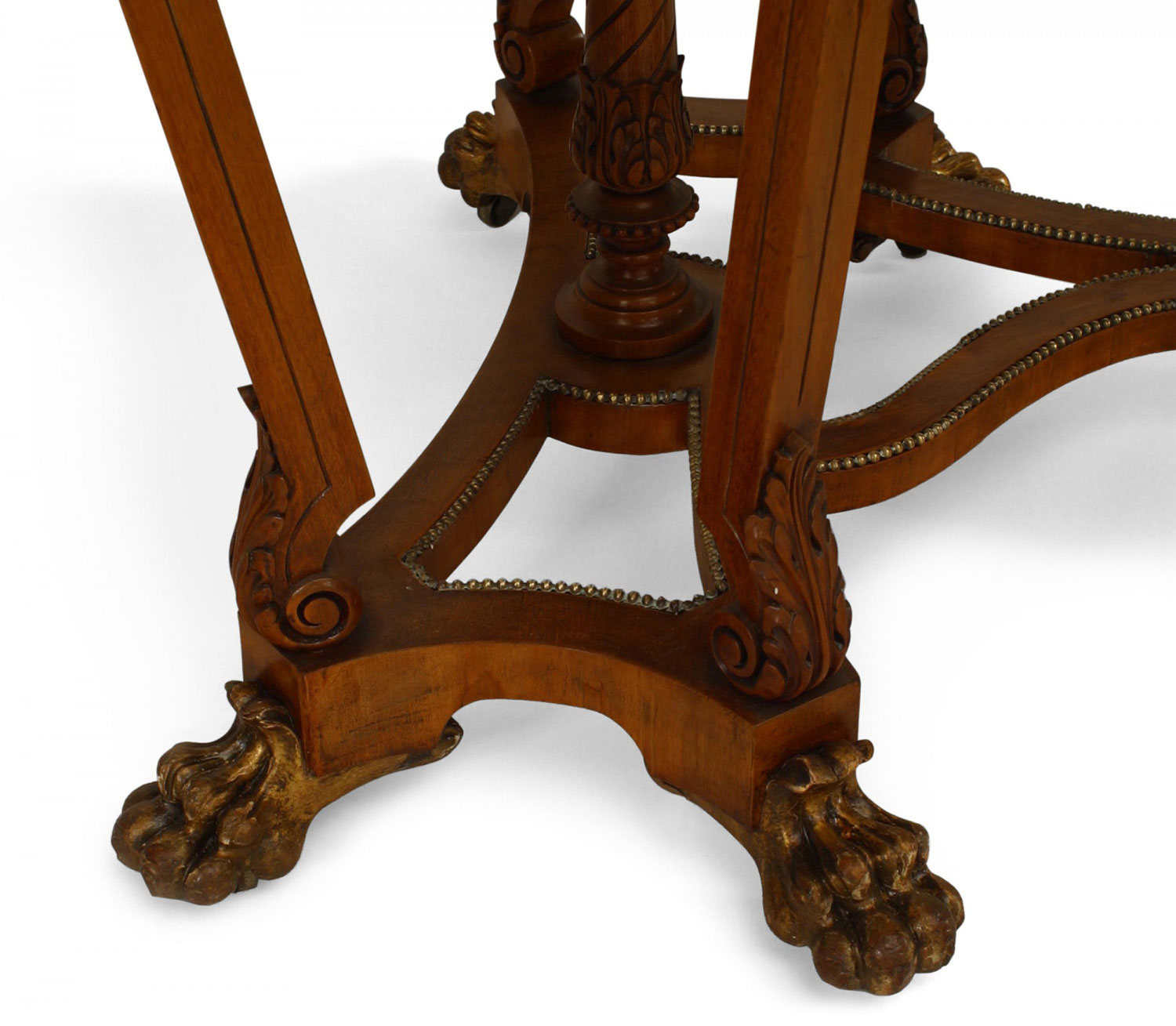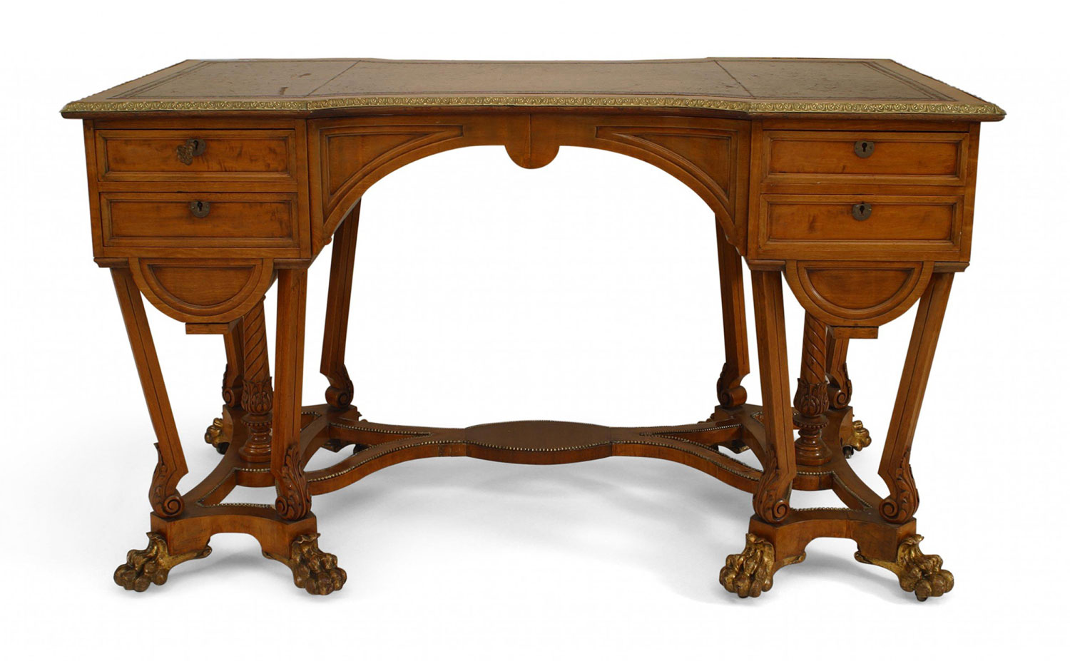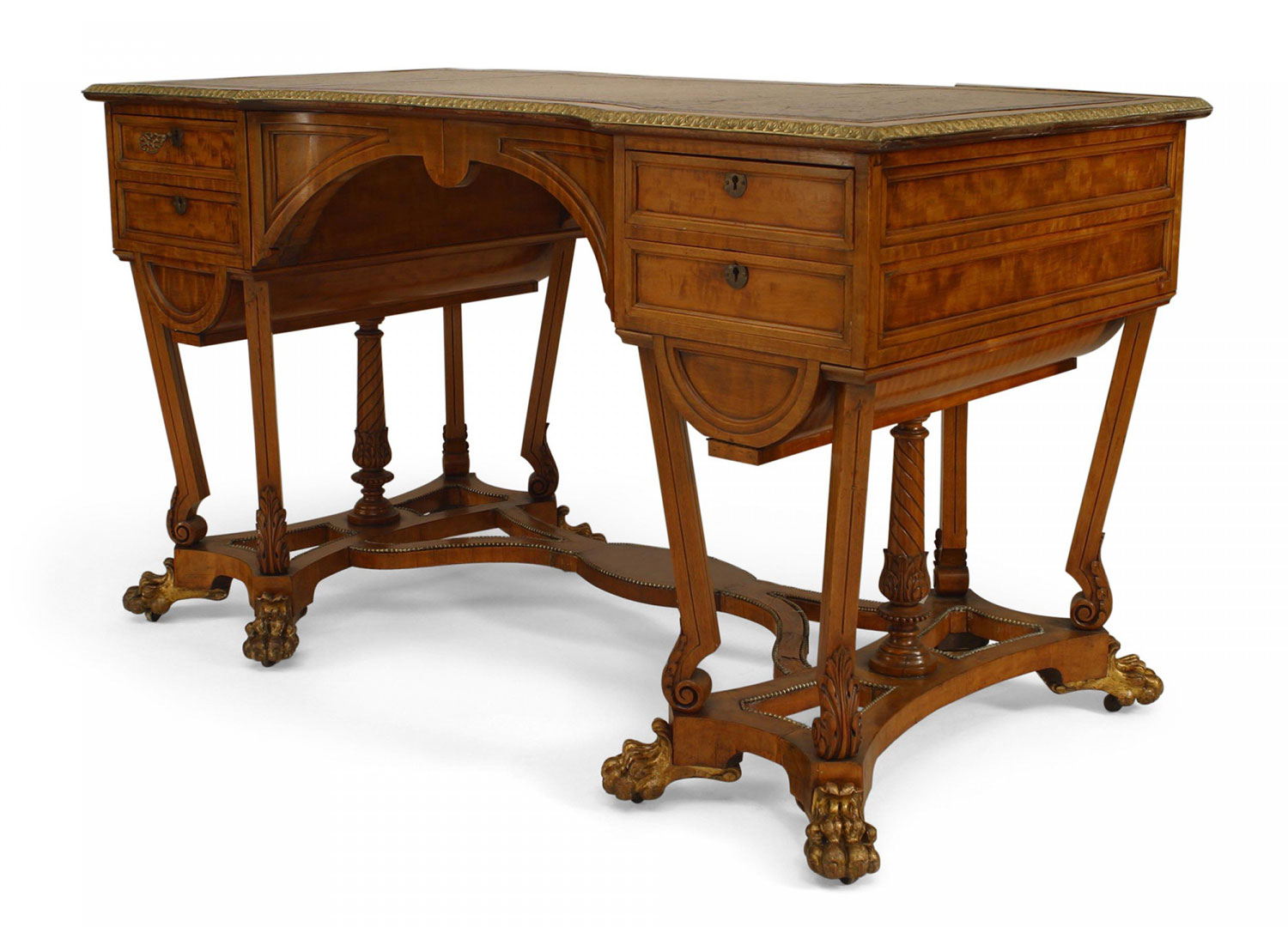 English Regency style (circa 1850s) satinwood desk with inset brown leather having a gilt bronze trimmed edge top over drawers on 2 sets of 4 legs with gilt claw feet joined by stretchers. (stamped EDWARDS AND ROBERTS).
