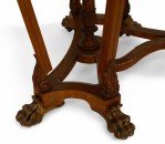 English Regency style (circa 1850s) satinwood desk with inset brown leather having a gilt bronze trimmed edge top over drawers on 2 sets of 4 legs with gilt claw feet joined by stretchers. (stamped EDWARDS AND ROBERTS)..