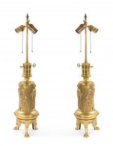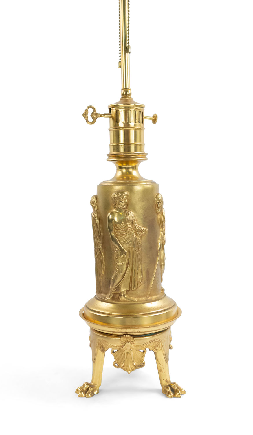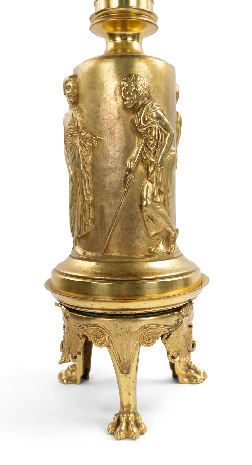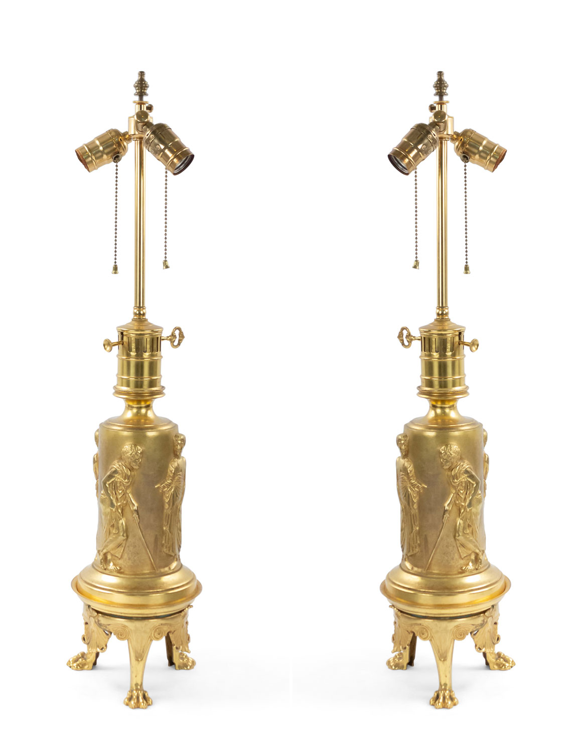 PAIR of English Regency-style (19th Century) bronze dore table lamps, originally for oil, with classic figures in relief on 3 legged base (PRICED AS PAIR).