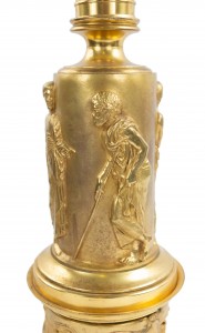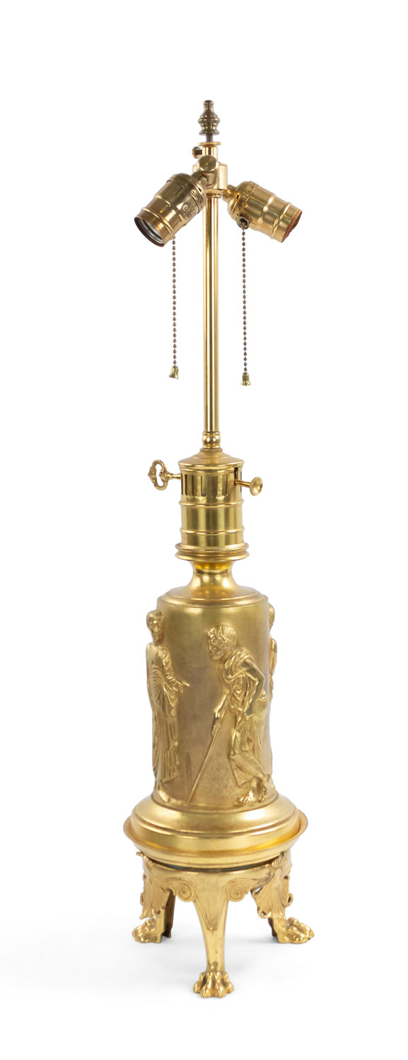 PAIR of English Regency-style (19th Century) bronze dore table lamps, originally for oil, with classic figures in relief on 3 legged base (PRICED AS PAIR)..