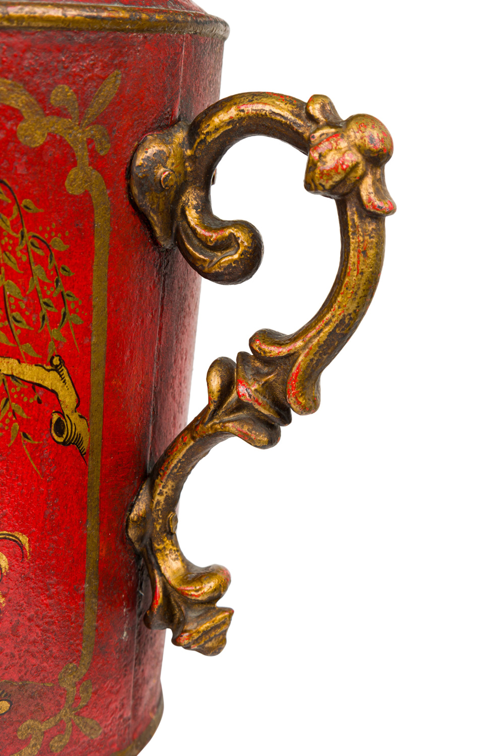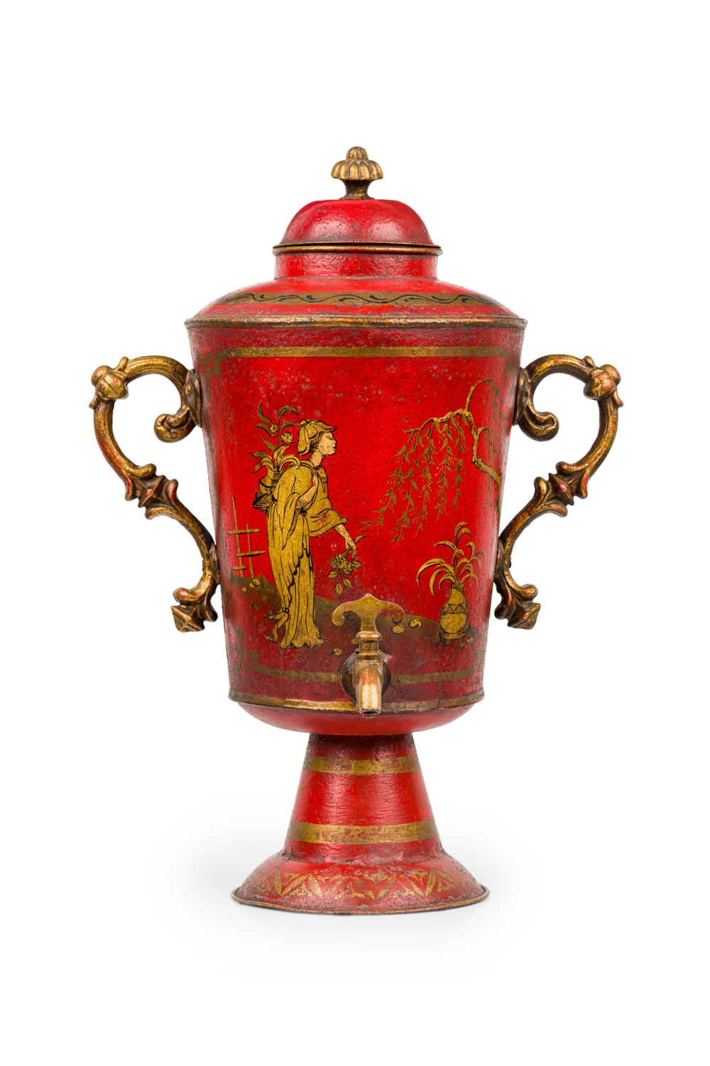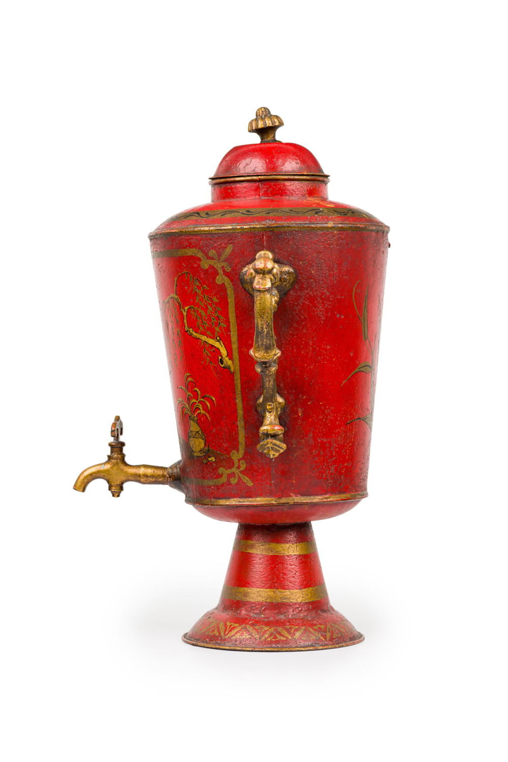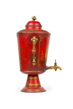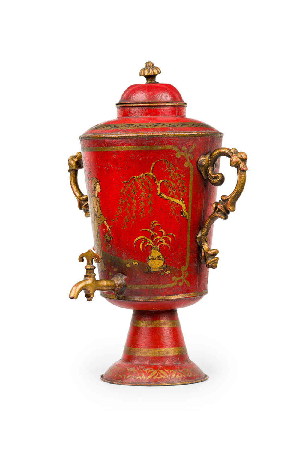 English Regency-style (20th Century) red lacquered chinoiserie decorated tole samovar with gilt handles.
