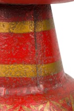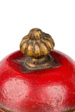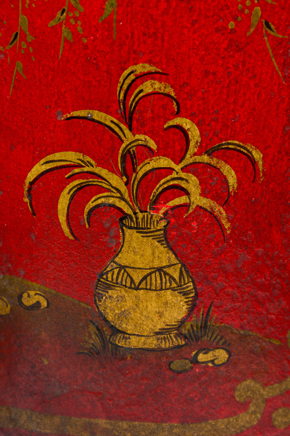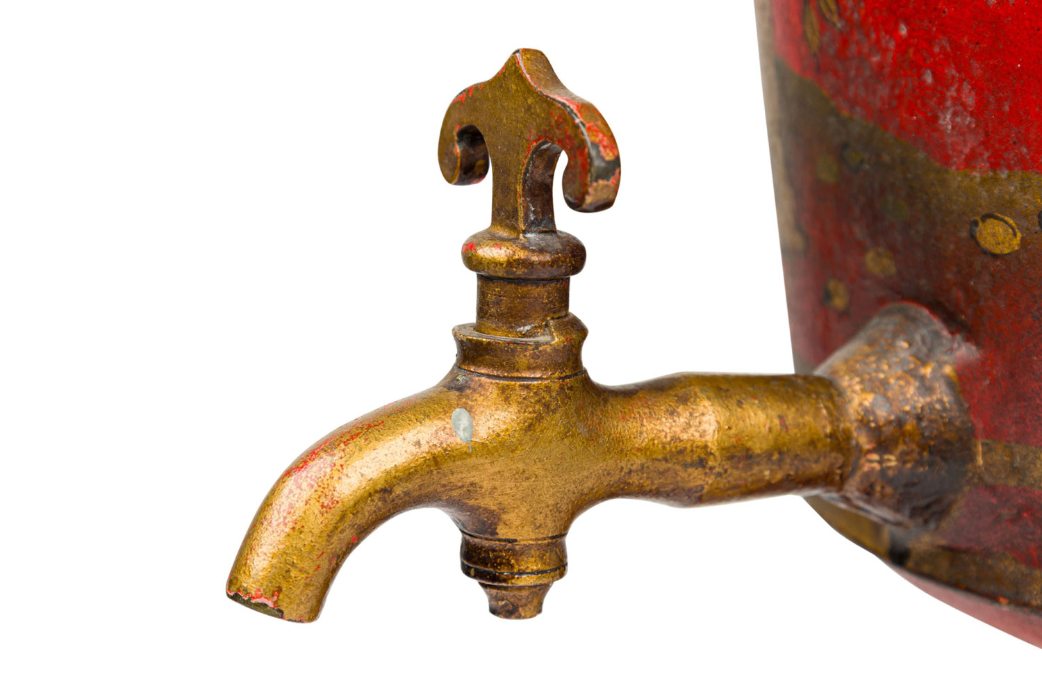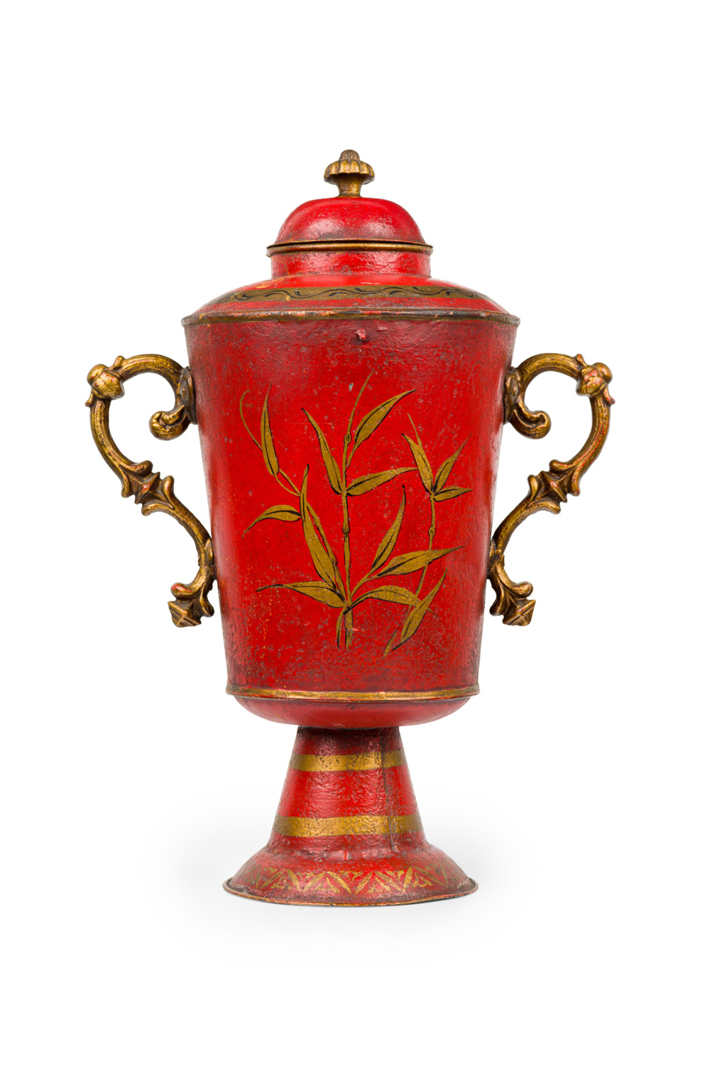 English Regency-style (20th Century) red lacquered chinoiserie decorated tole samovar with gilt handles.
