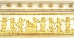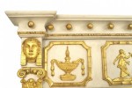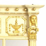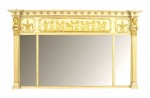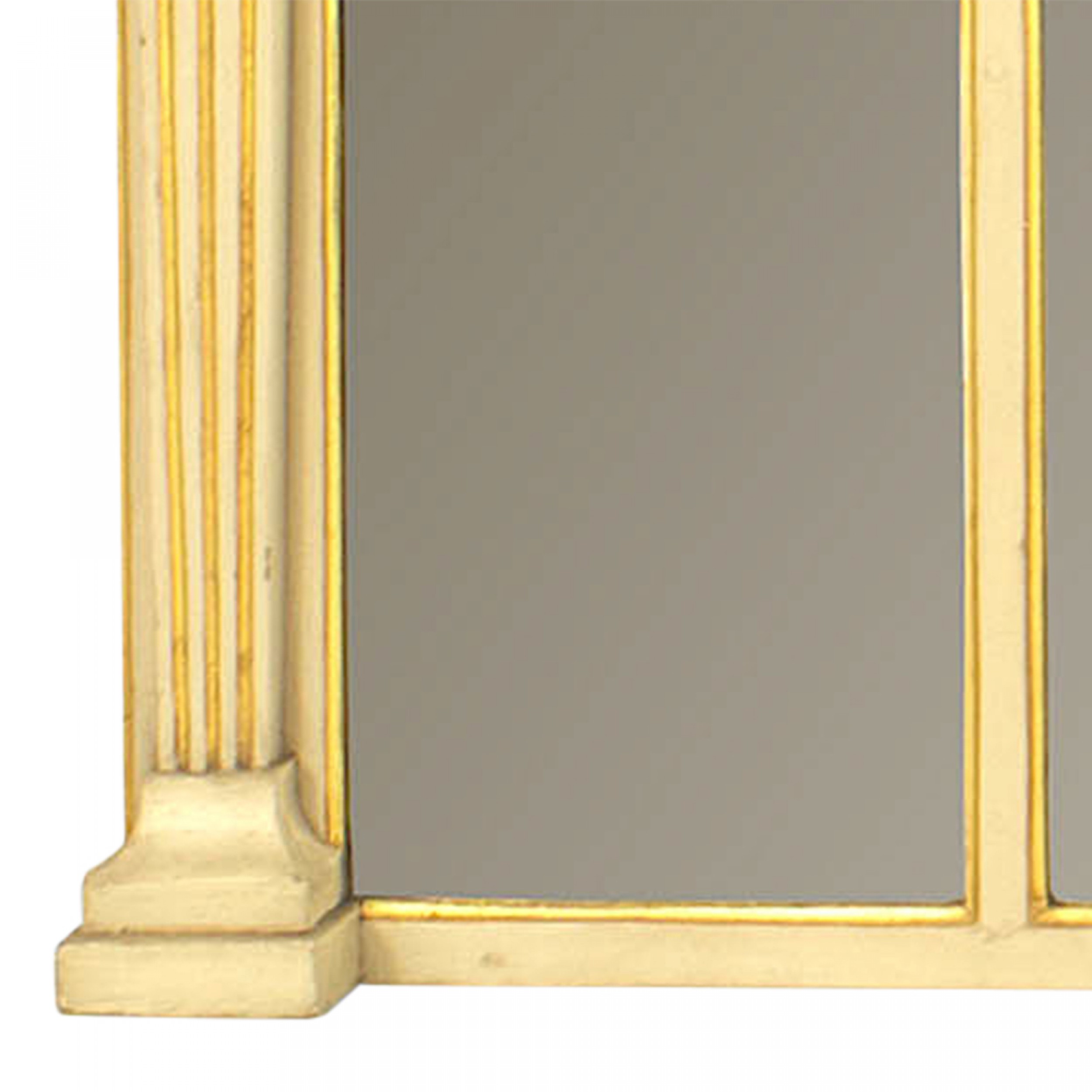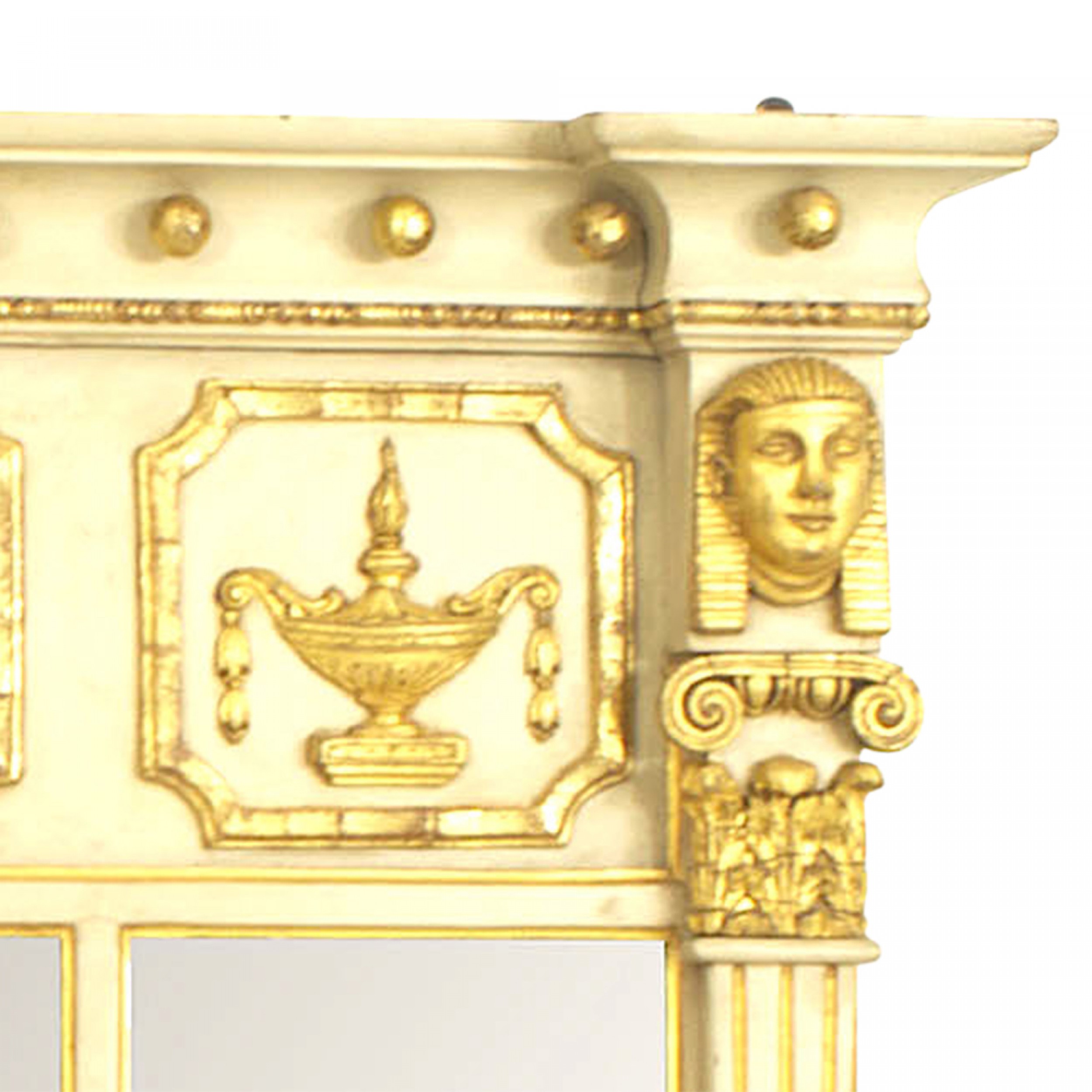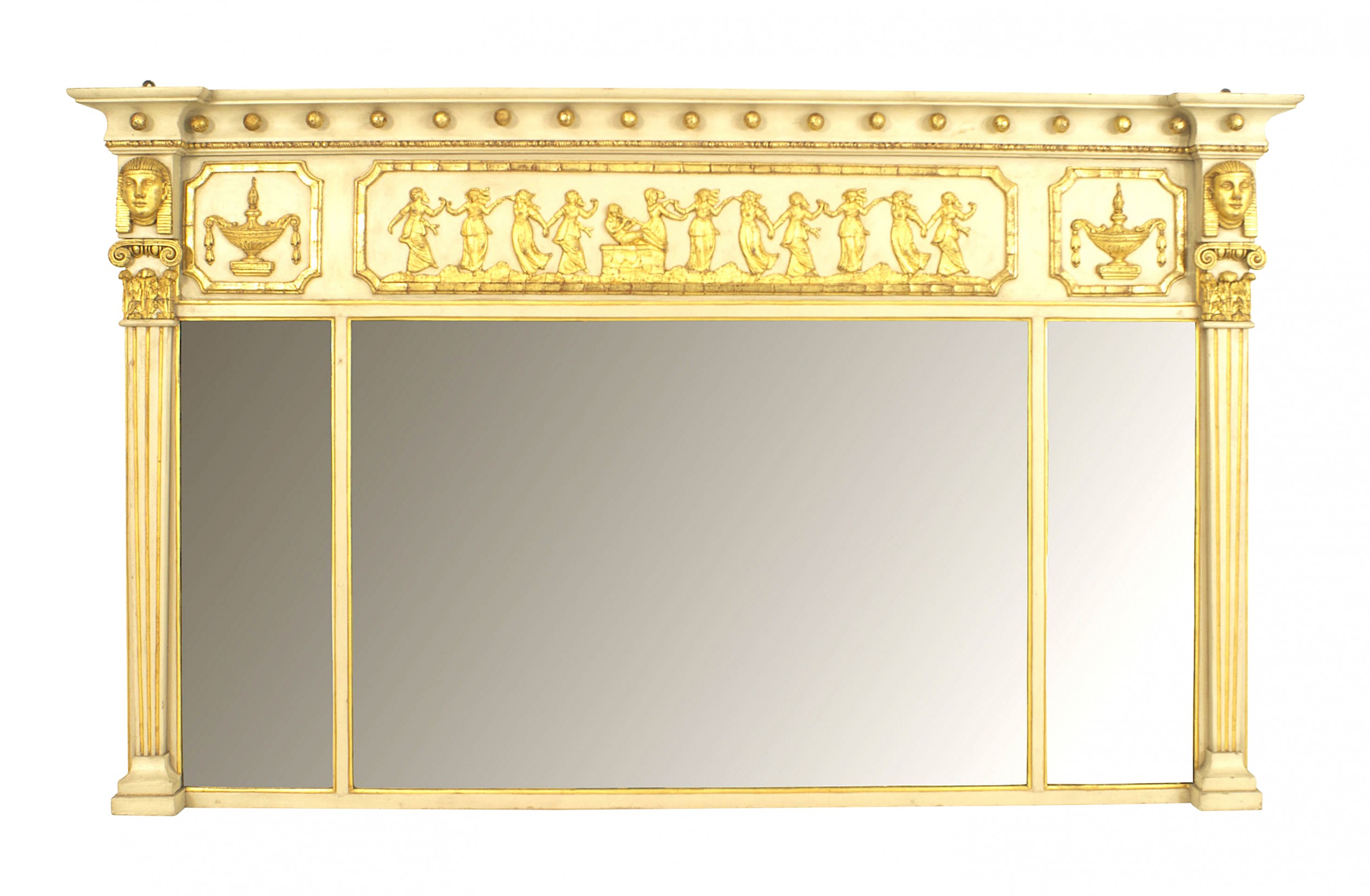 English Regency-style horizontal cream painted and gilt trimmed three-section wall mirror with fluted column pilaster sides under classical heads and a relief of dancing figures..