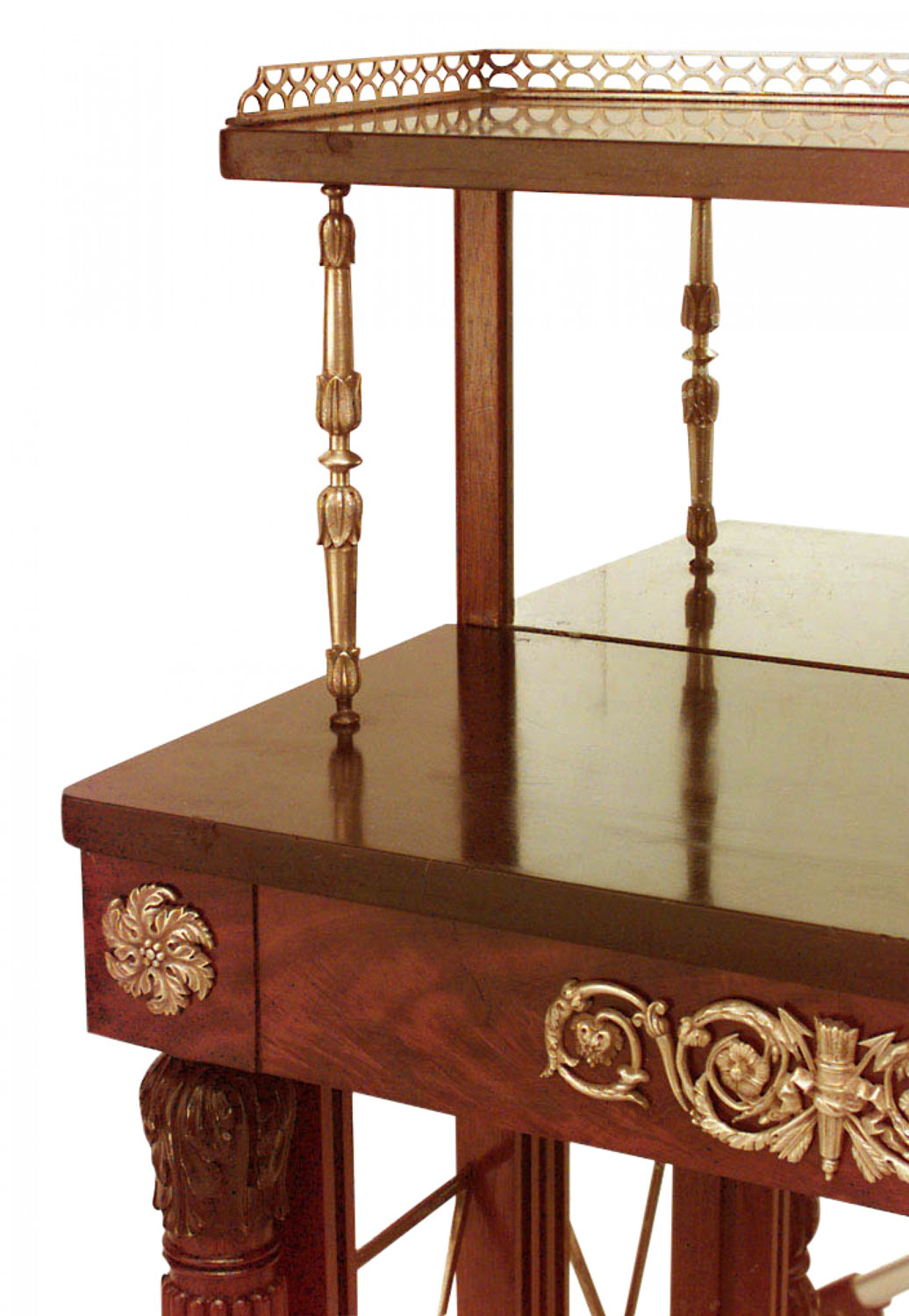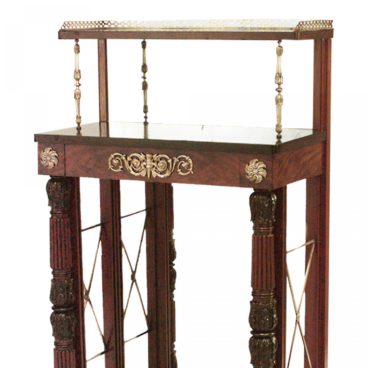 English Regency-style (19th Century) narrow mahogany mirrored back etagere with black marble top and upper shelf with gallery and bronze trim.