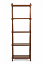 English Regency-style (late 20th Century) mahogany etagere with latticed sides and four solid shelves..