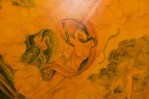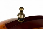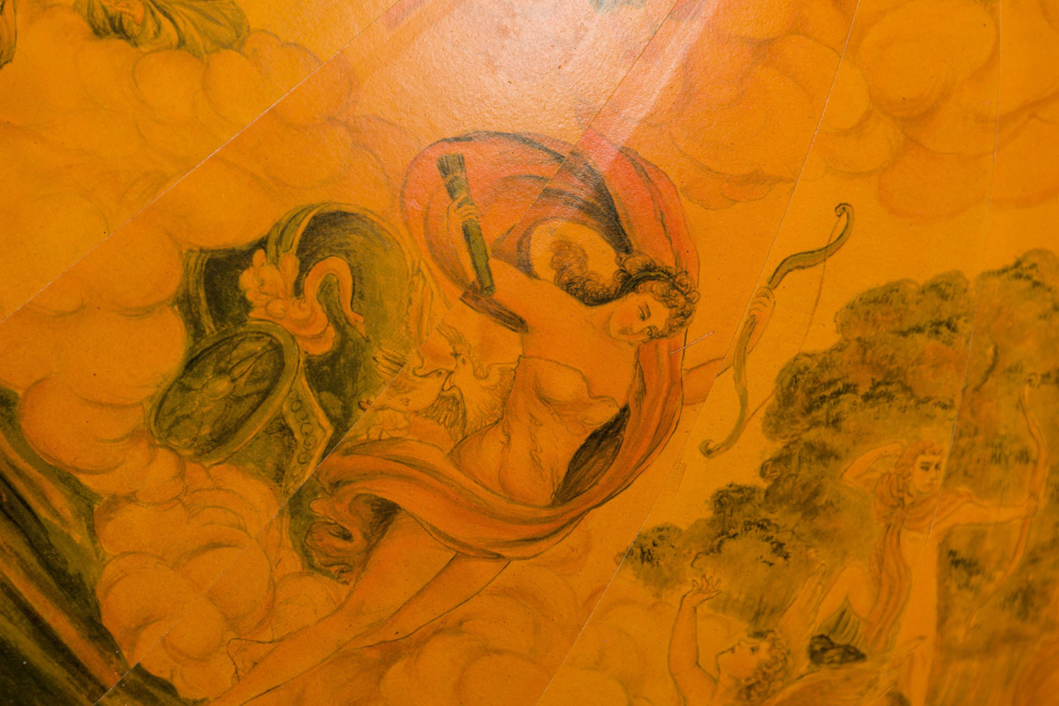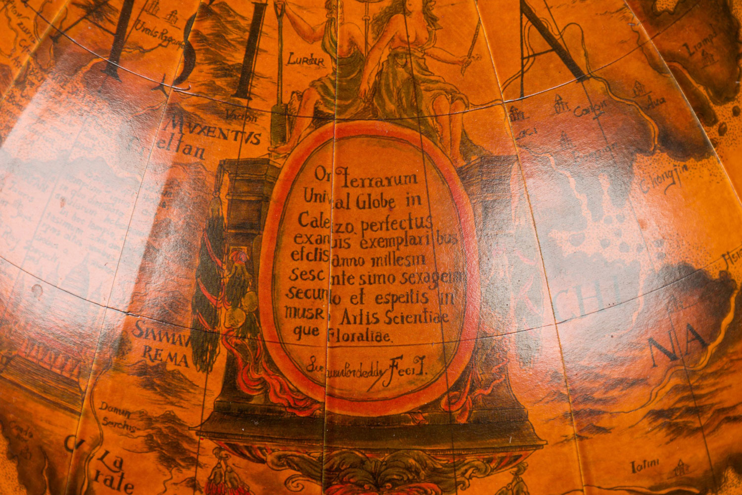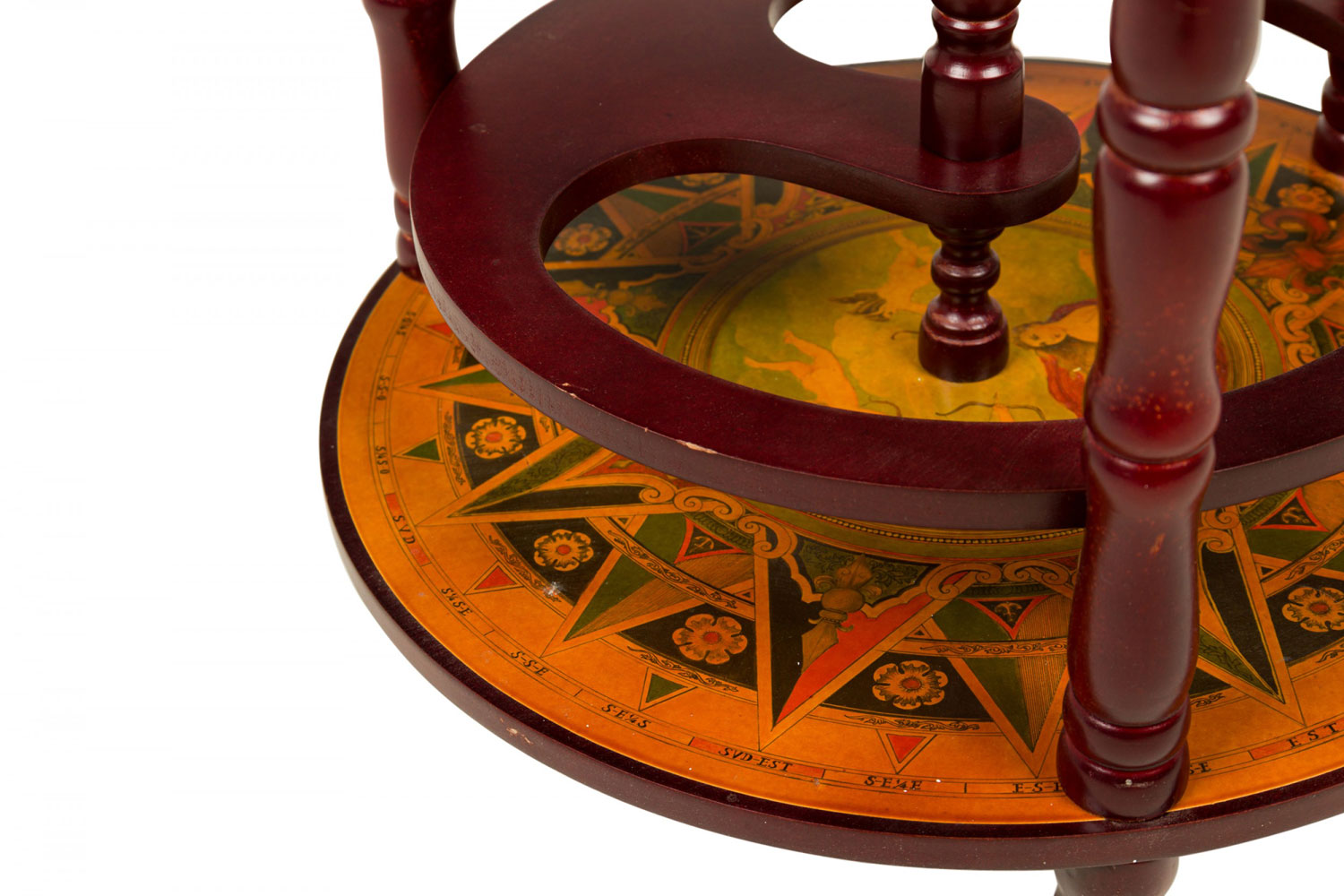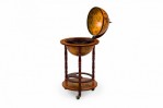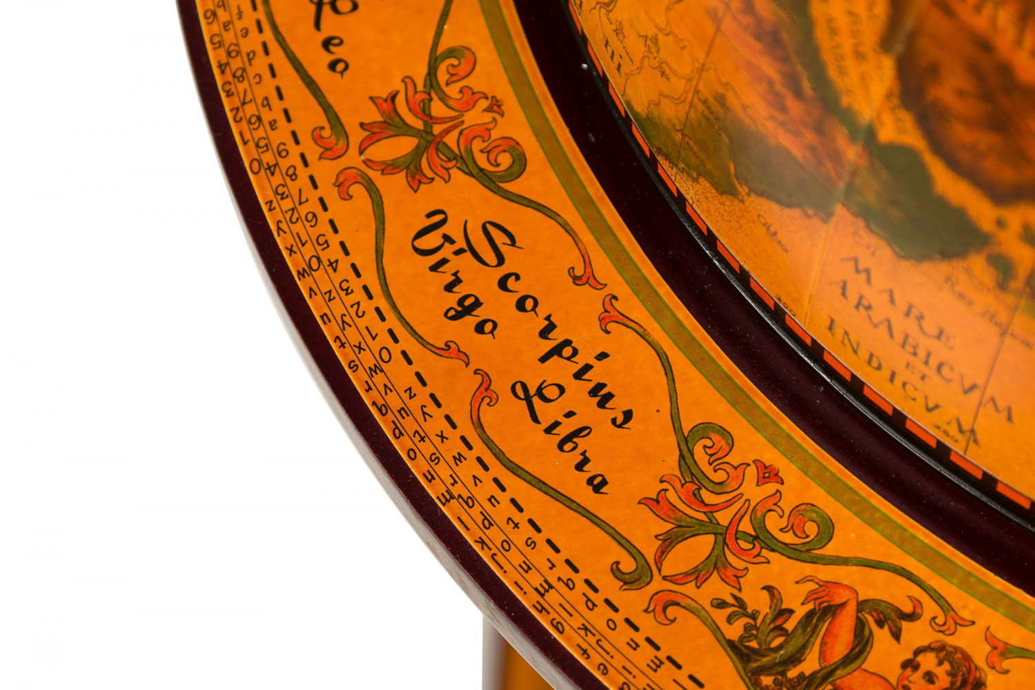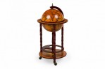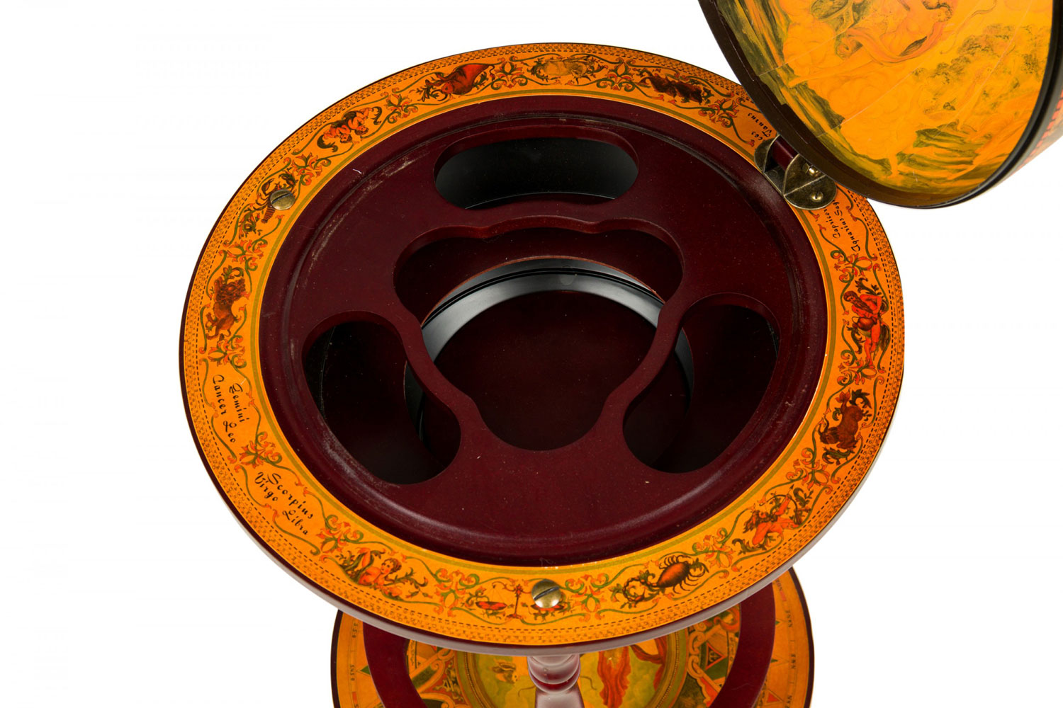 English Regency-style (Mid-Century) novelty bar concealed in a bisected hinged globe head mounted on a round three legged stand on casters.