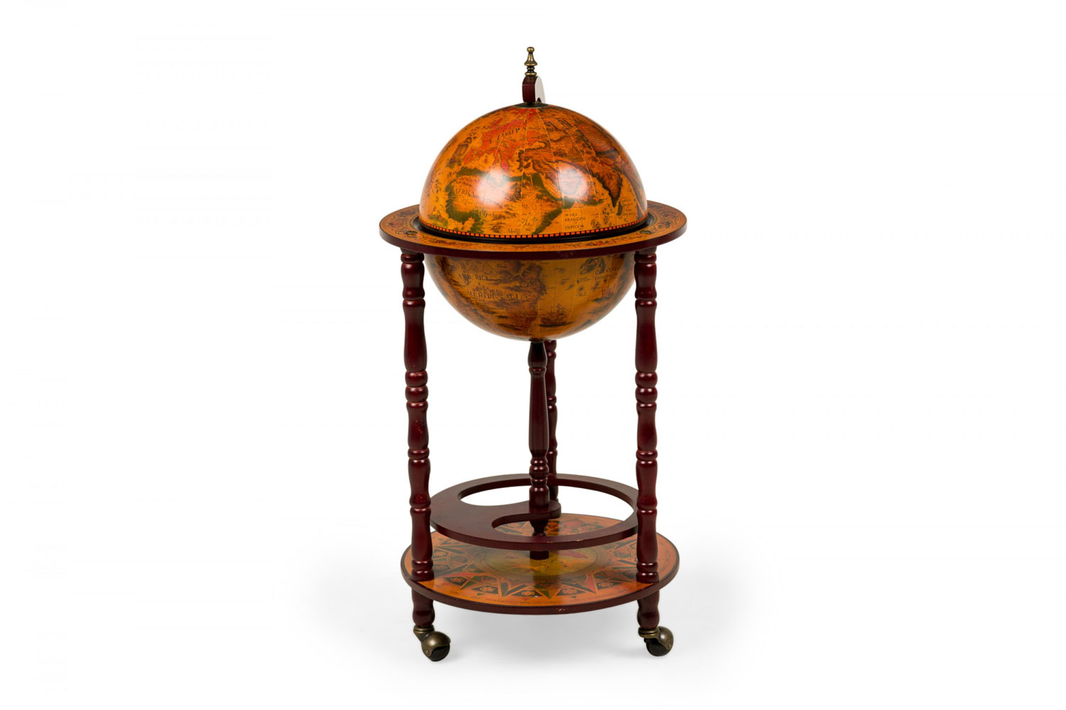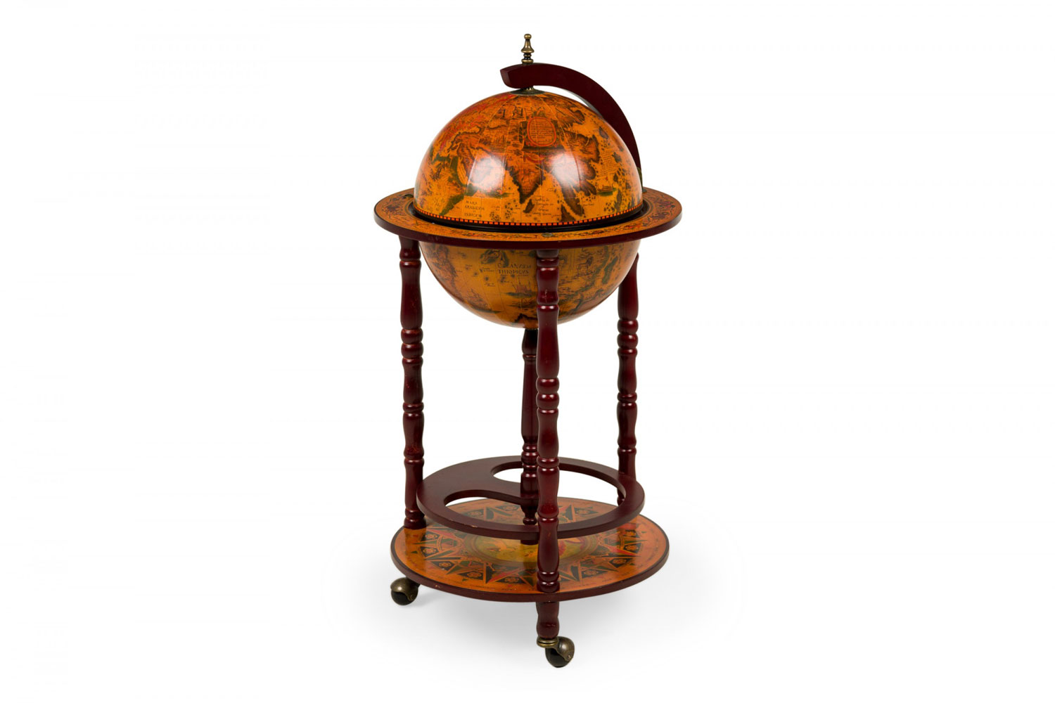 English Regency-style (Mid-Century) novelty bar concealed in a bisected hinged globe head mounted on a round three legged stand on casters..