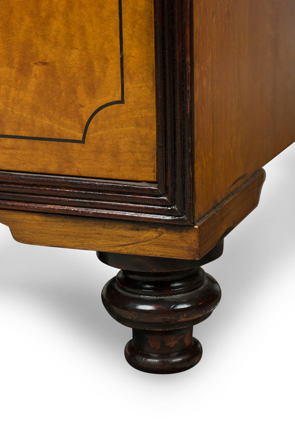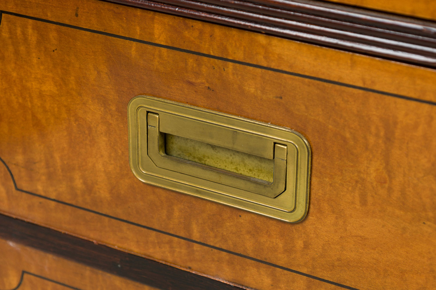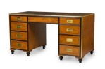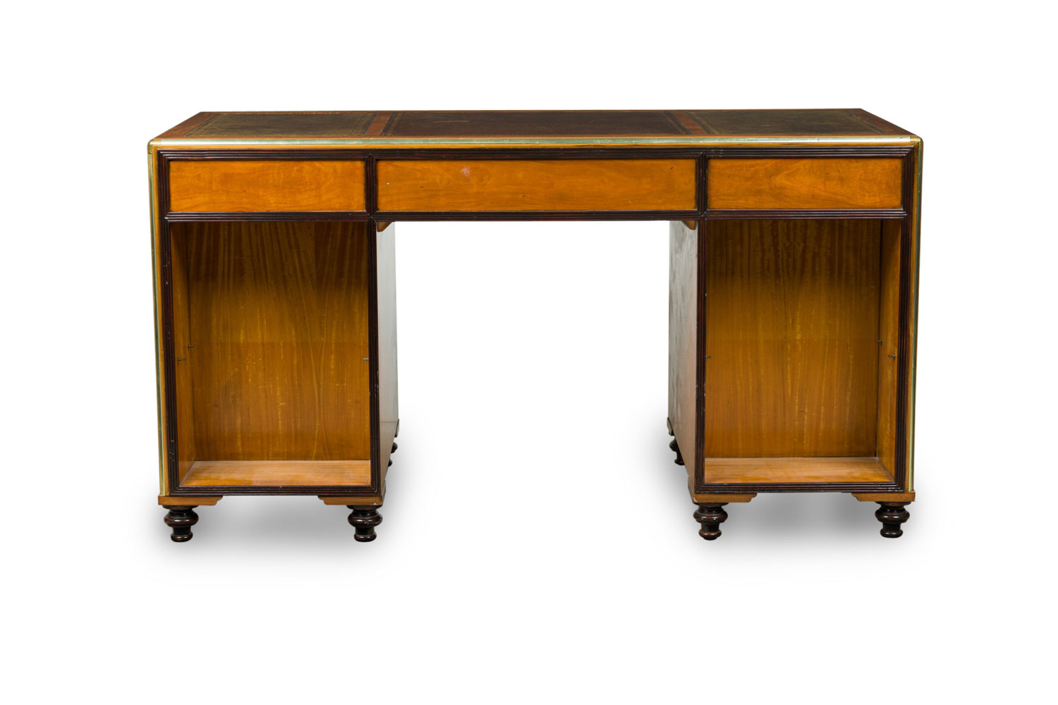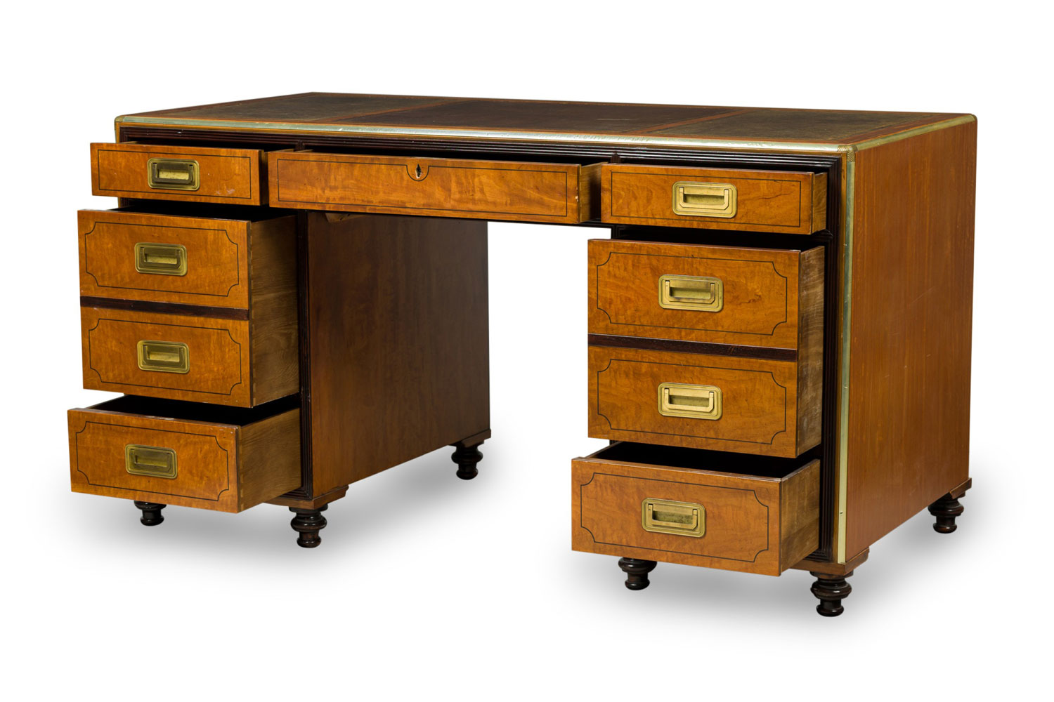 English Regency-Style (20th Century) campaign / kneehole desk with two cabinet columns with four drawers each having square inset brass drawer pulls and ebonized trim, and a central drawer, supporting a desktop with three brown leather insets..