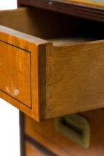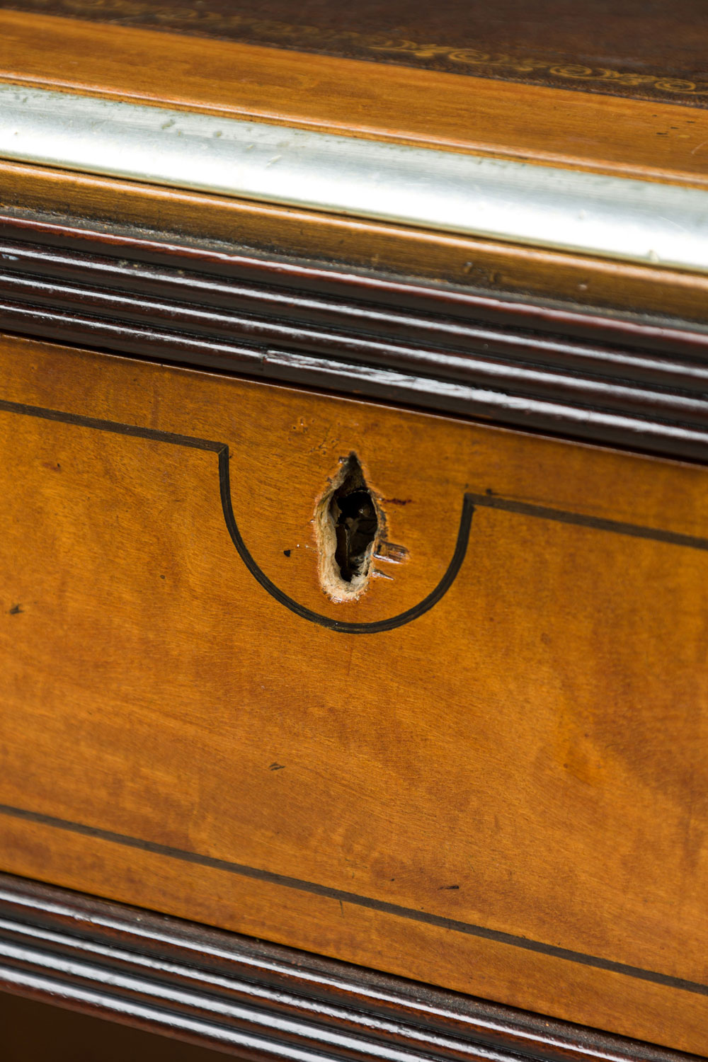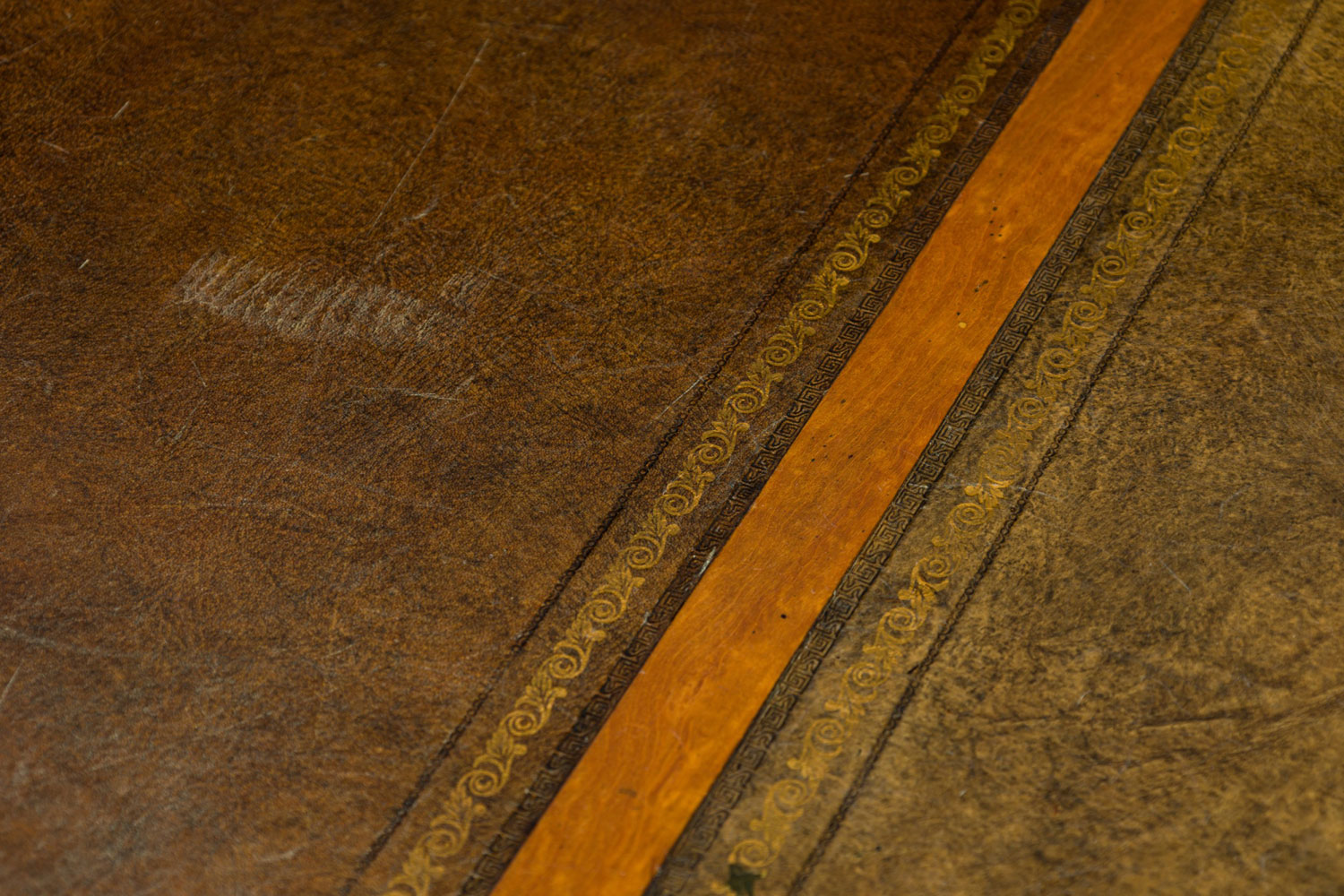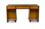 Style: English Materials & Techniques: Brass, inlaid, inlay, leather, metal, wood Category: Office/Library Condition: Significant wear and aging to leather desktop insets, scuffs to finish throughout. Good; Wear consistent with age and use