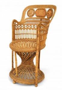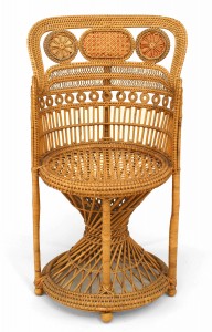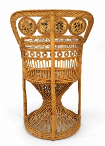 Style: Wicker Materials & Techniques: Glass, natural, wicker Category: Seating, Wicker Condition: Missing back ball foot, yet stable to sit in.