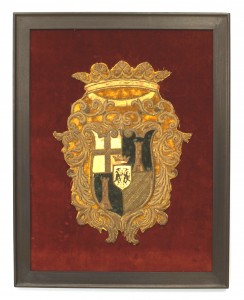Style: English Materials & Techniques: Crest, embroidery, velvet, wood, woven Category: Cleared Art, Rugs/Textile