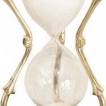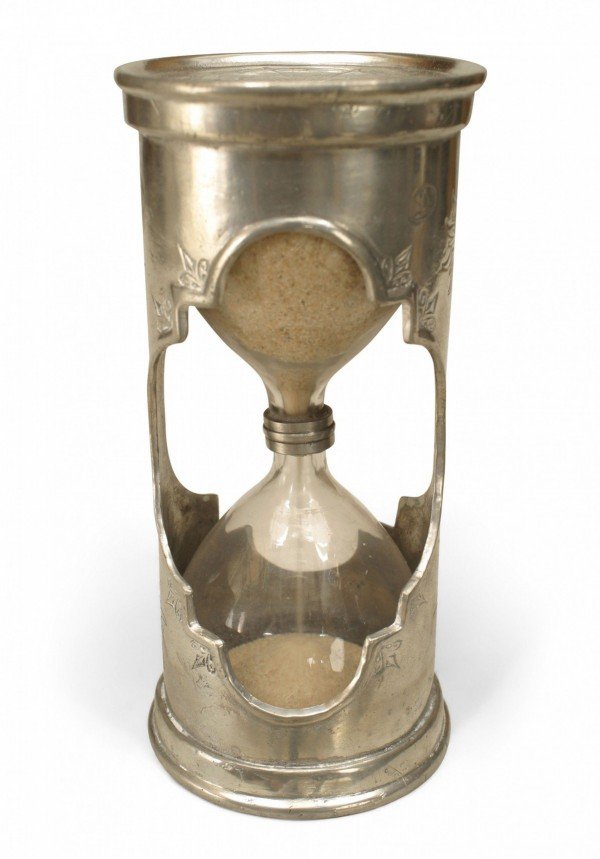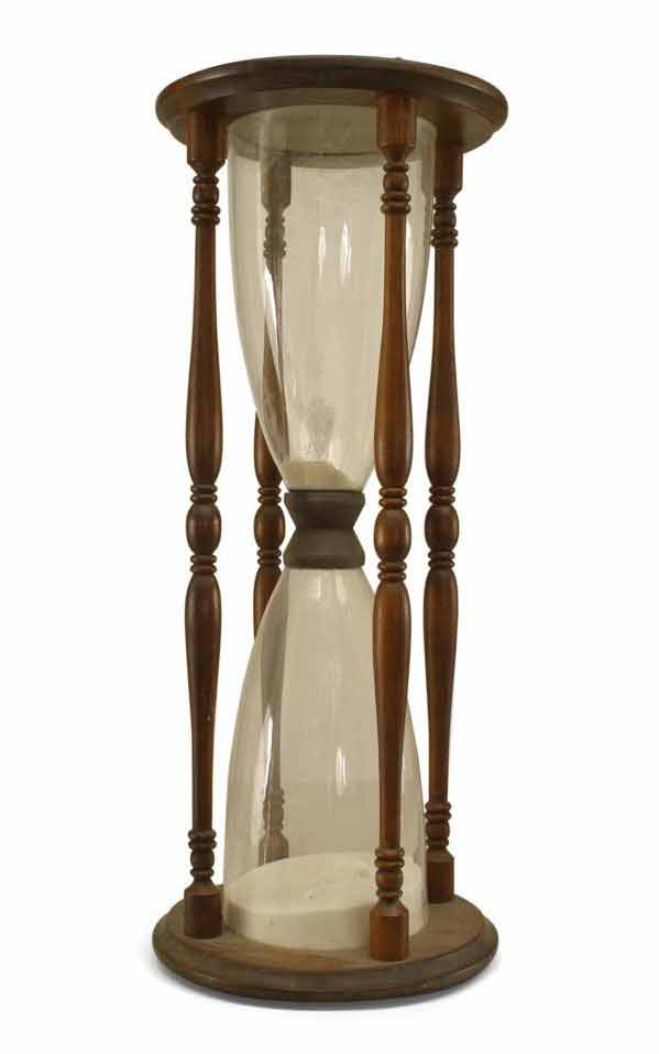 English Renaissance-style (20th Century) mahogany hour glass with 3 brass scroll supports and finials.
