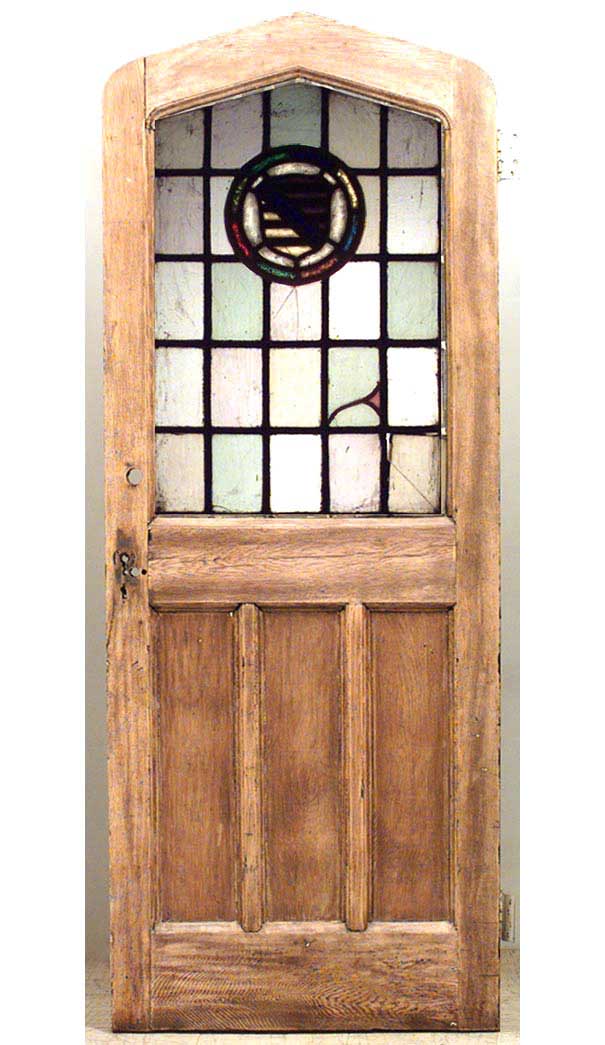 English Renaissance style (19th Century) oak framed door with arch top and leaded-glass panel with round medallion.