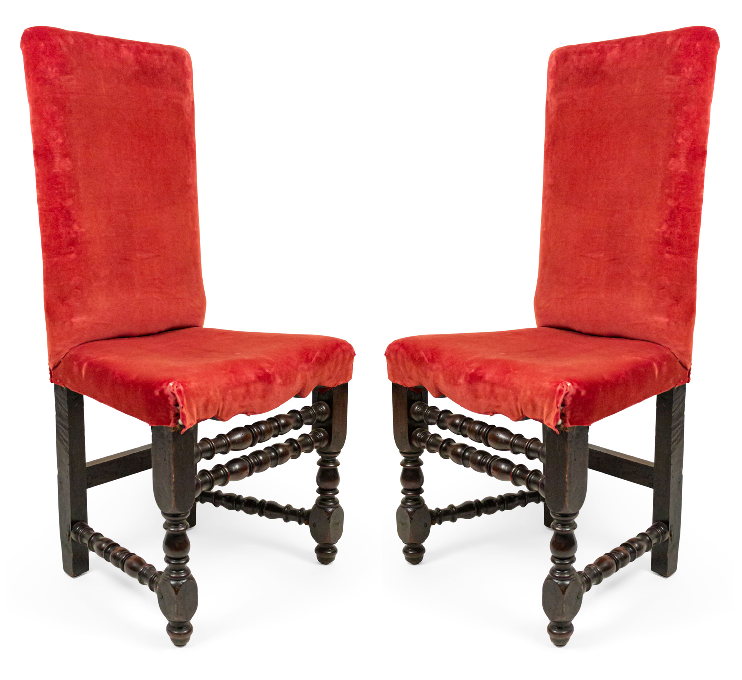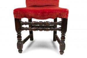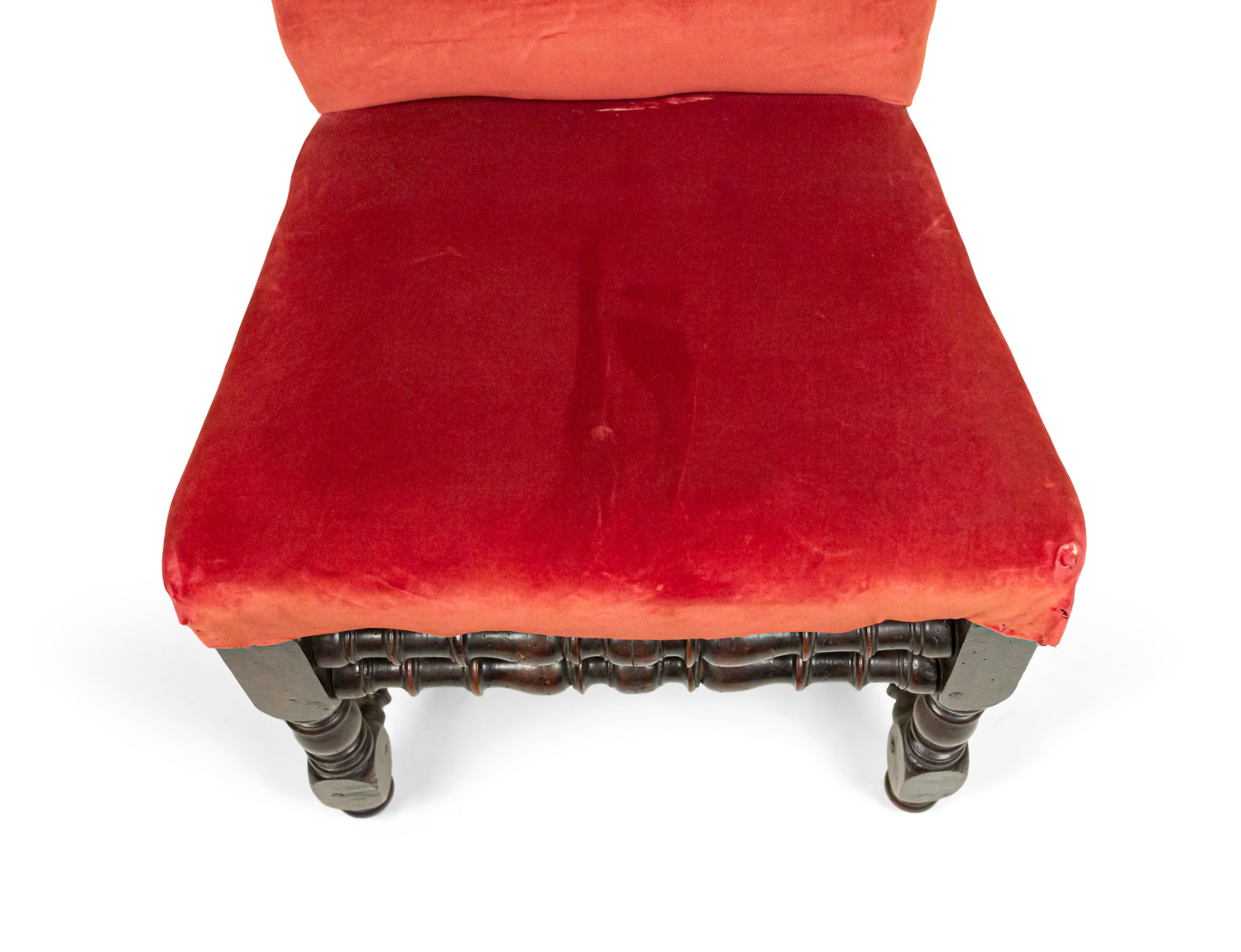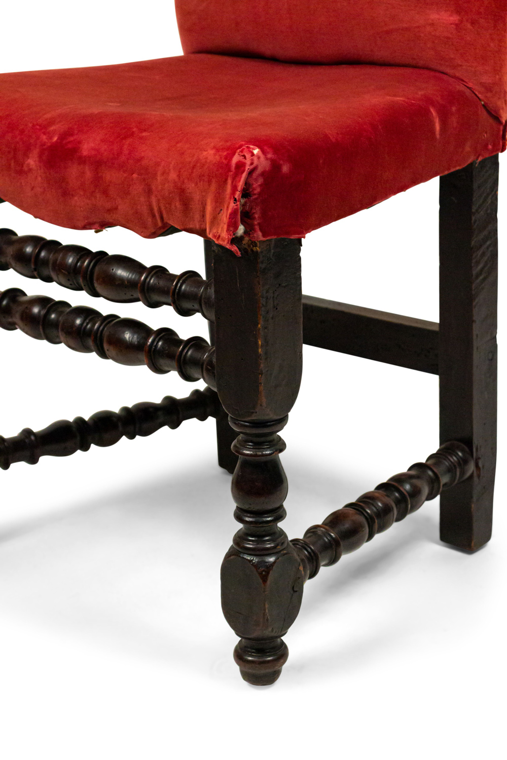 SET of 4 English Renaissance (17/18th Century) walnut joint leg side chairs with double front spool stretcher and red velvet upholstered seat and back (PRICED AS SET).