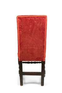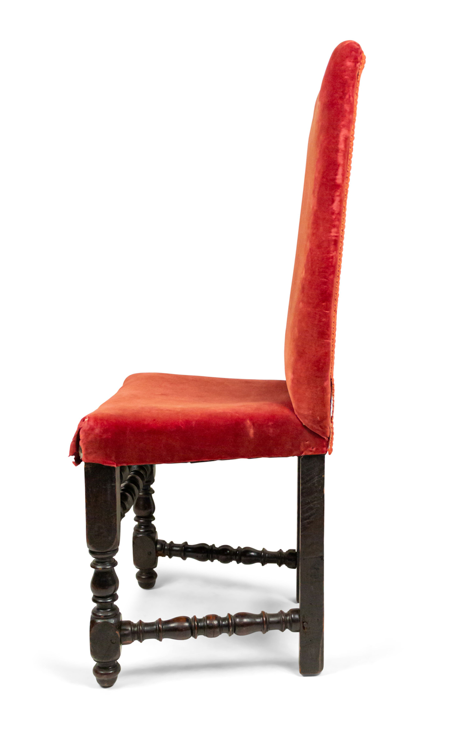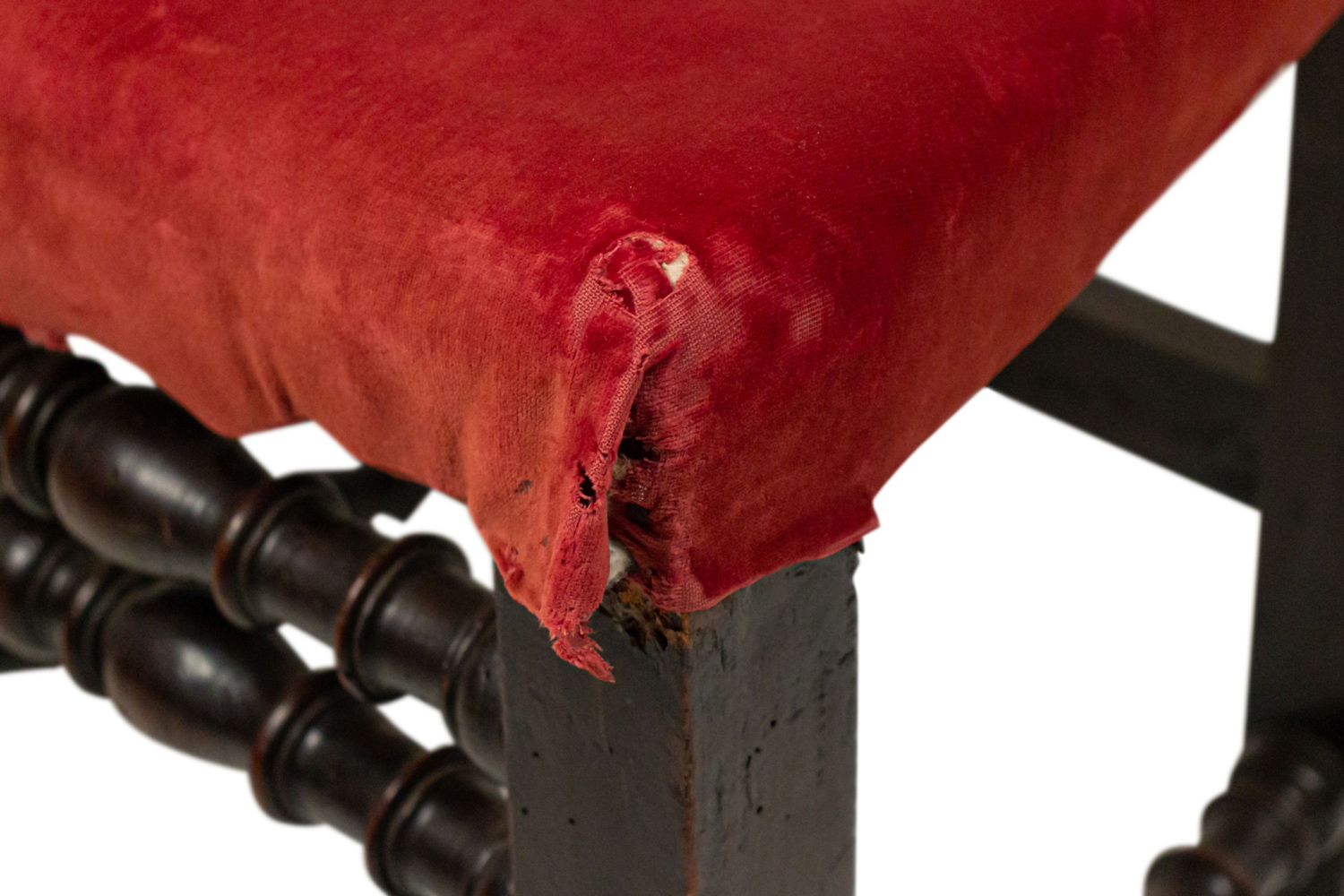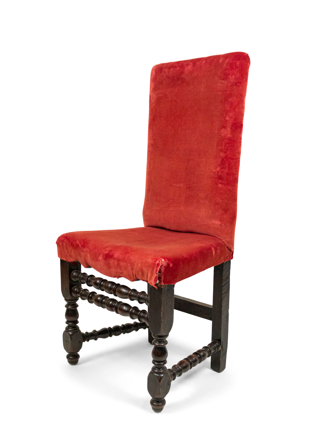 SET of 4 English Renaissance (17/18th Century) walnut joint leg side chairs with double front spool stretcher and red velvet upholstered seat and back (PRICED AS SET).