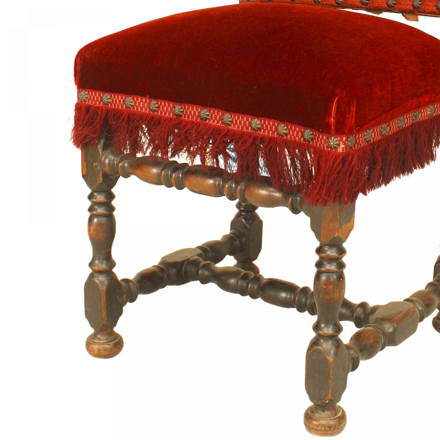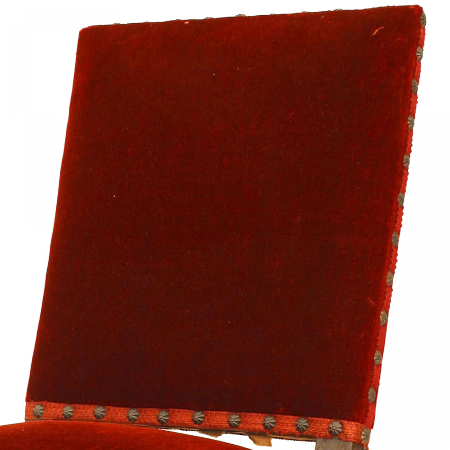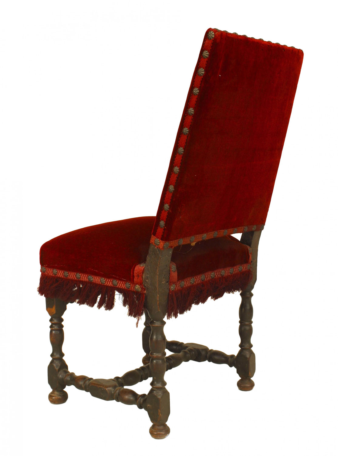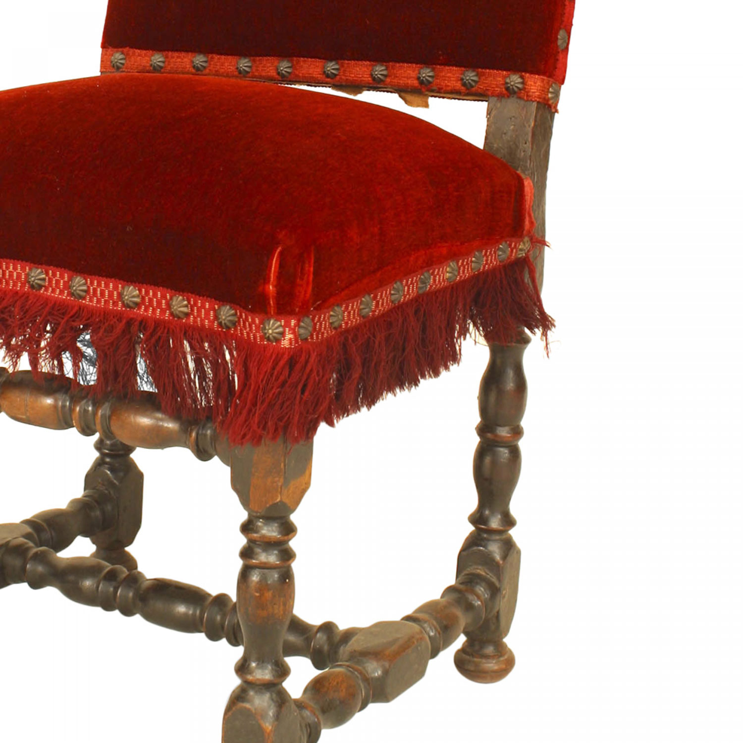 English Renaissance style oak carved side chair with a square back and stretcher with red velvet upholstered seat and back.