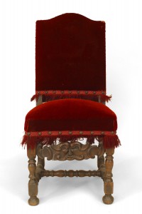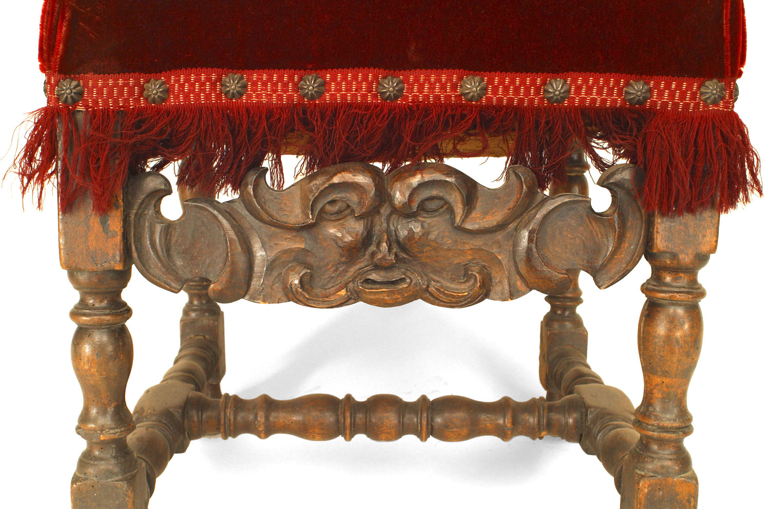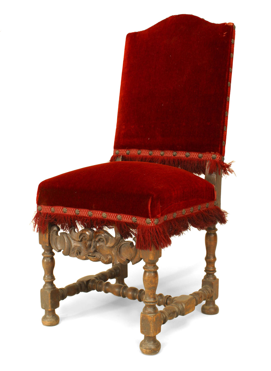 English Renaissance style oak carved side chair with a shaped back and stretcher with a carved front panel under seat and upholstered in red velvet..