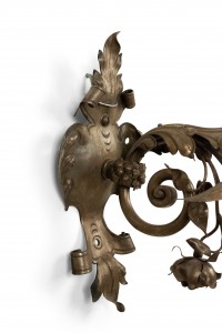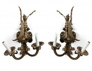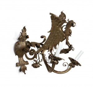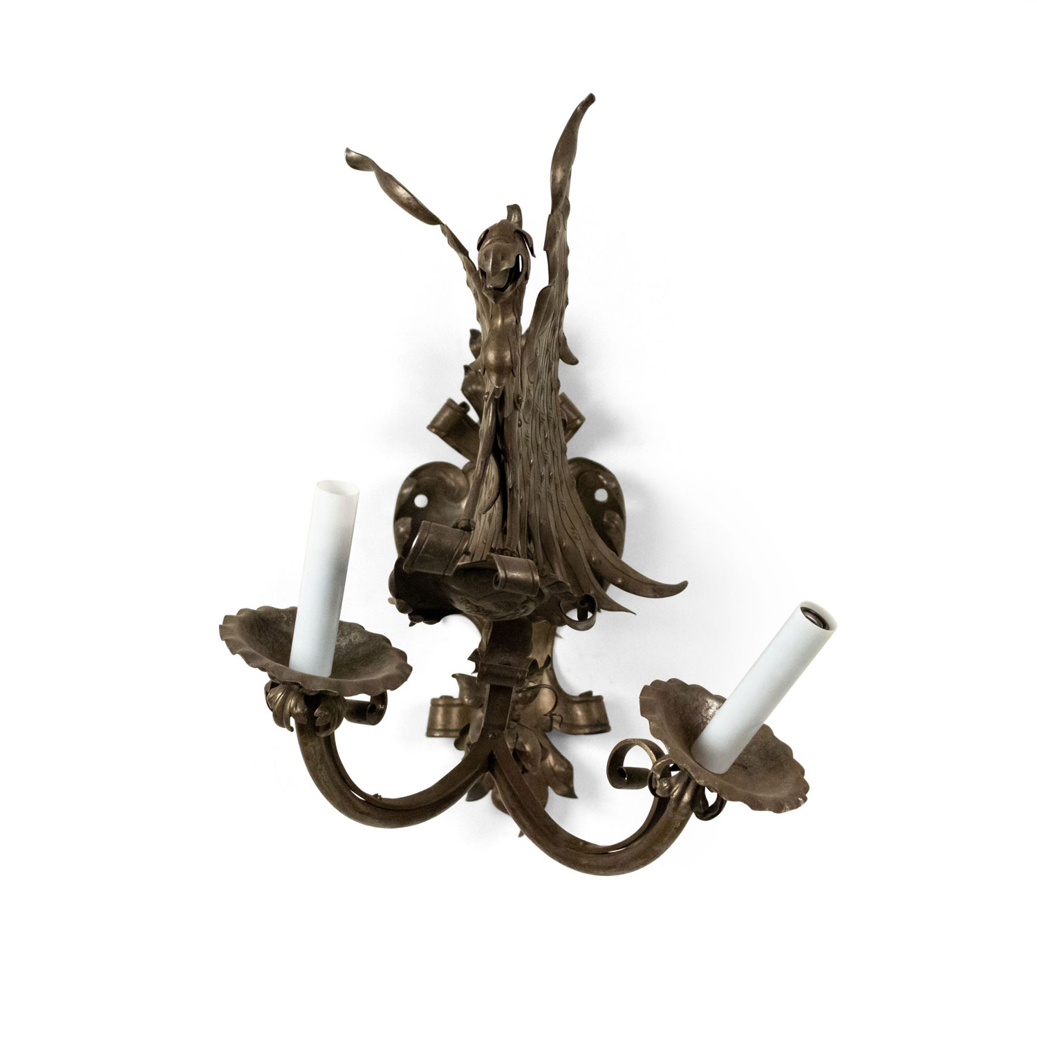 4 English Renaissance Revival (early 20th Century) steel wall sconces with two arms and a centered griffin perched above a coat of arms. (PRICED EACH).