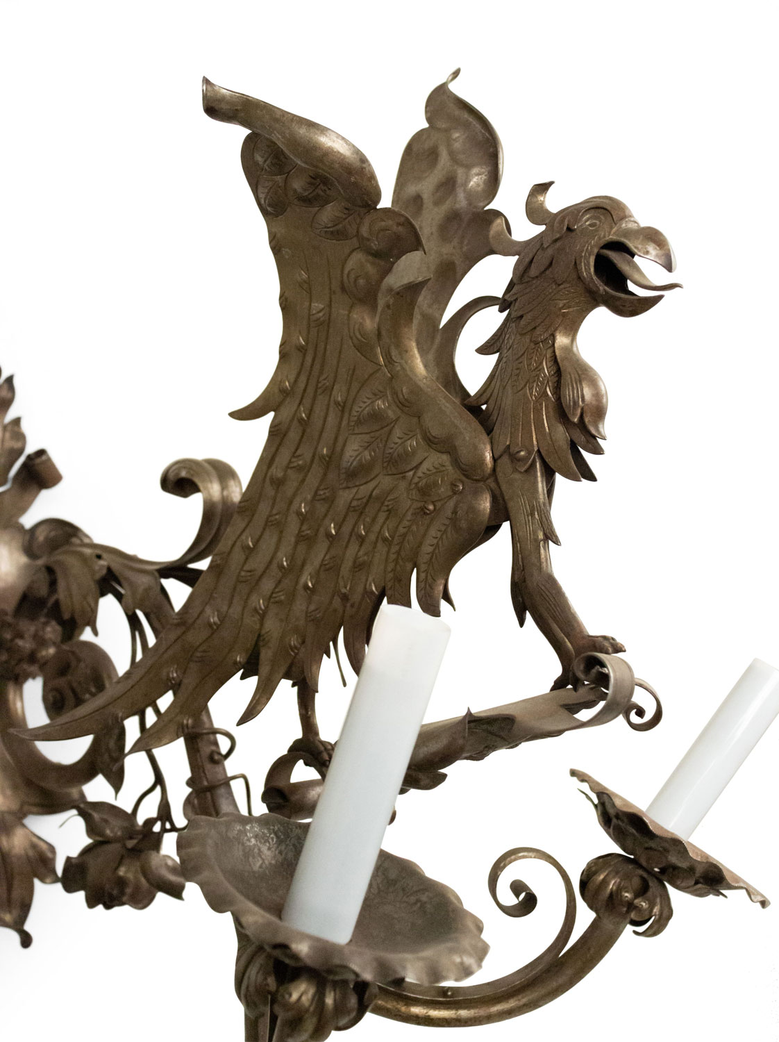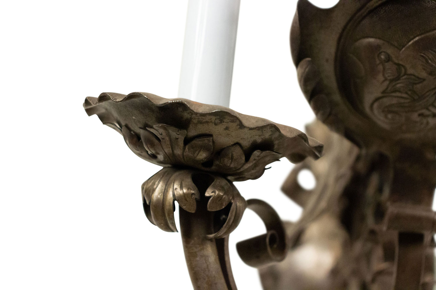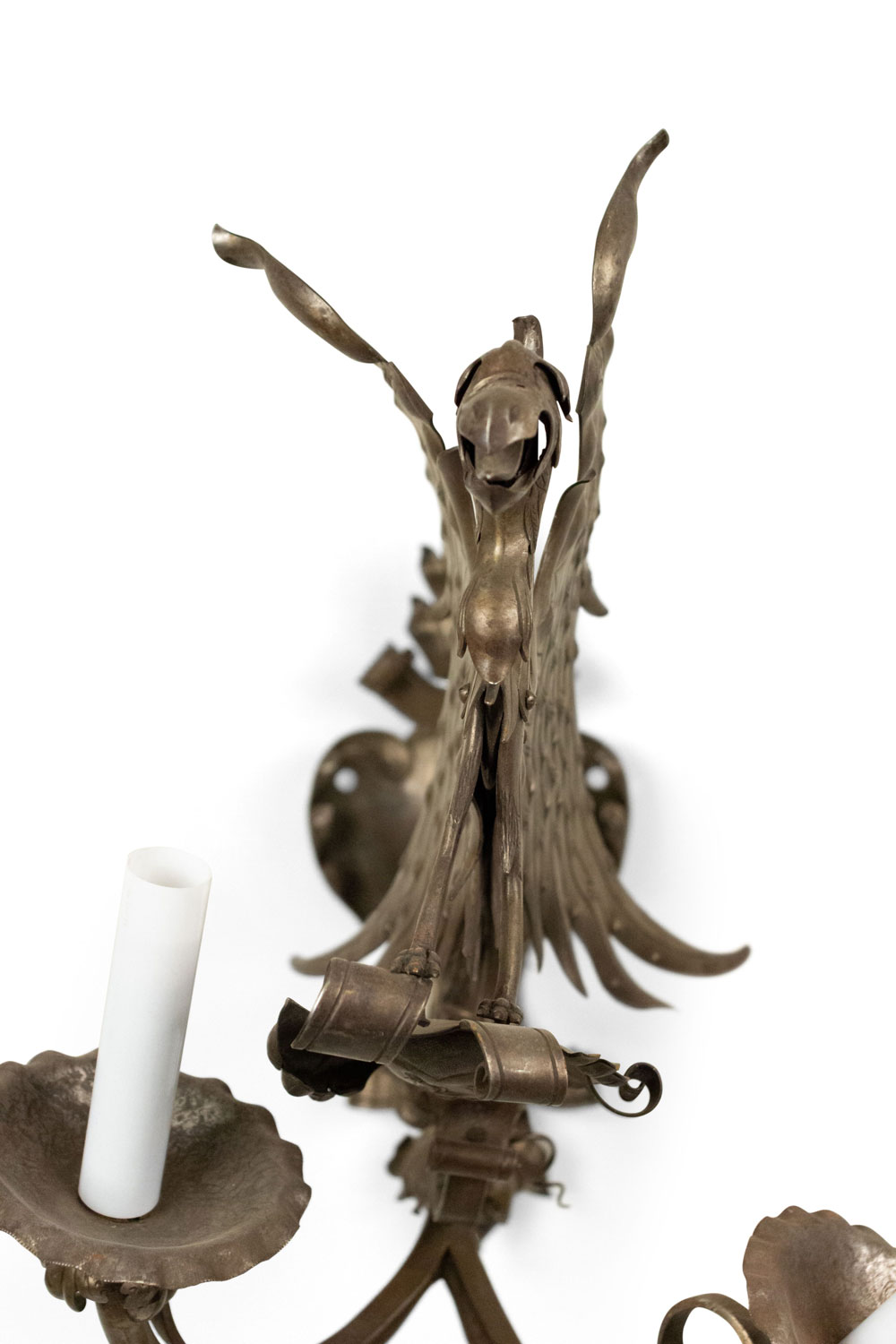 4 English Renaissance Revival (early 20th Century) steel wall sconces with two arms and a centered griffin perched above a coat of arms. (PRICED EACH)