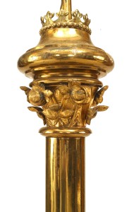 3 English Renaissance-style (Aesthetic Movement 19th Century) brass floor altar style candlesticks with glass jewels. (PRICED EACH)