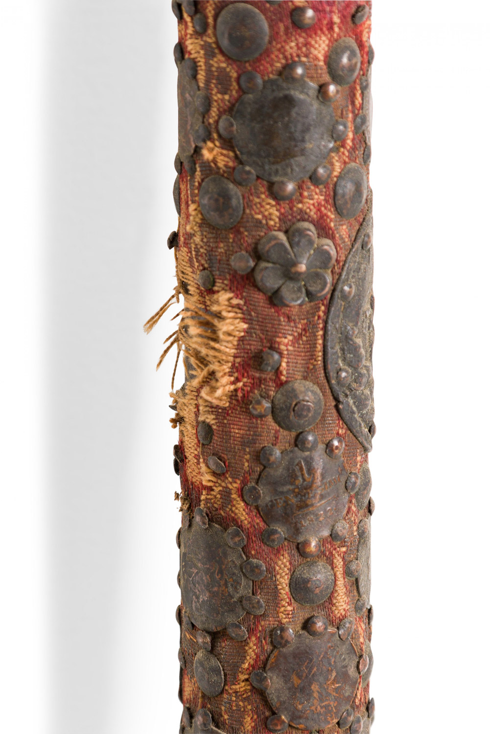 English Renaissance-style short halberd spear with velvet shaft and medallion trim with small iron blade..