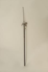 English Renaissance-style halberd spear with wooden shaft and small 29-inch iron ax blade..