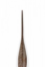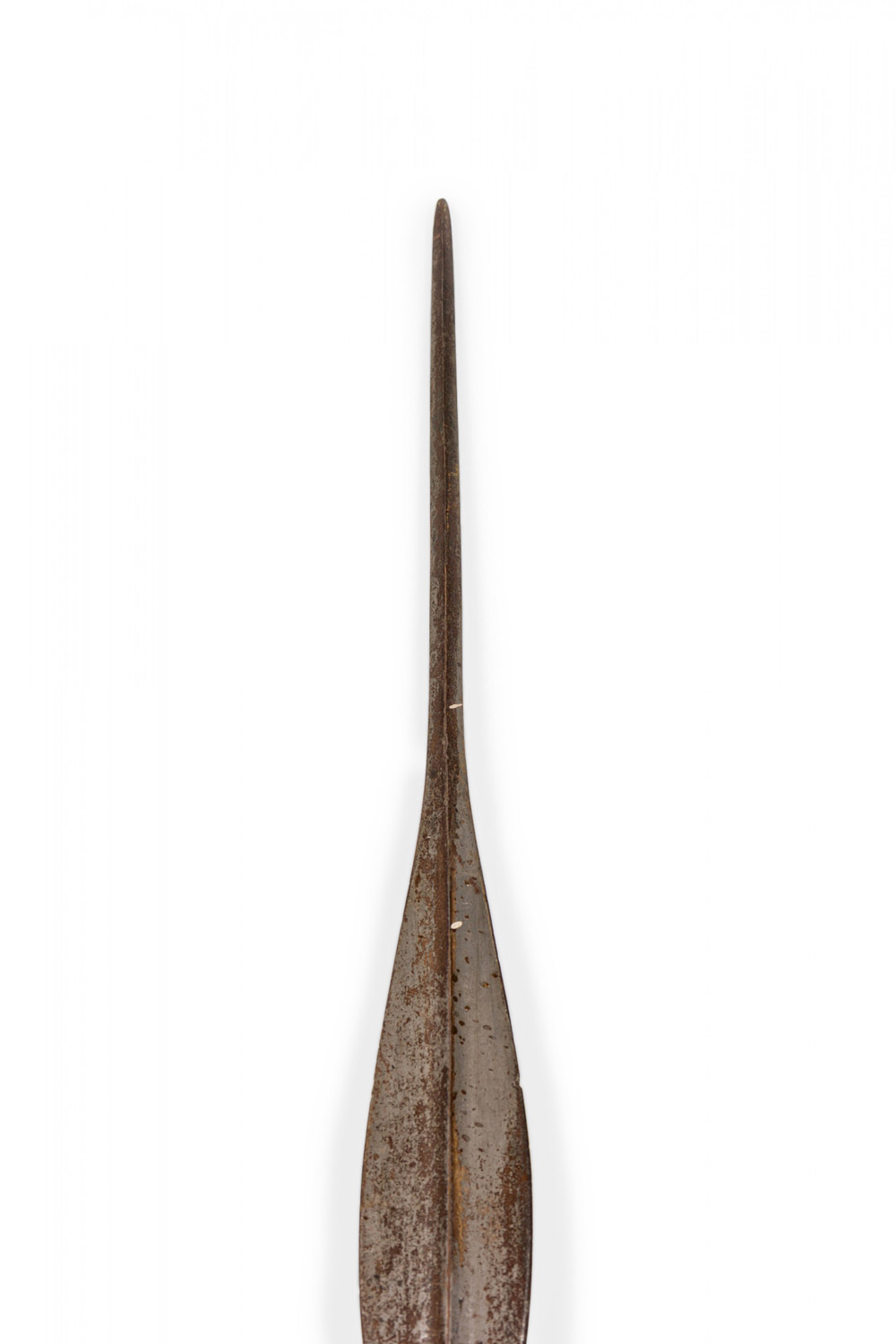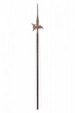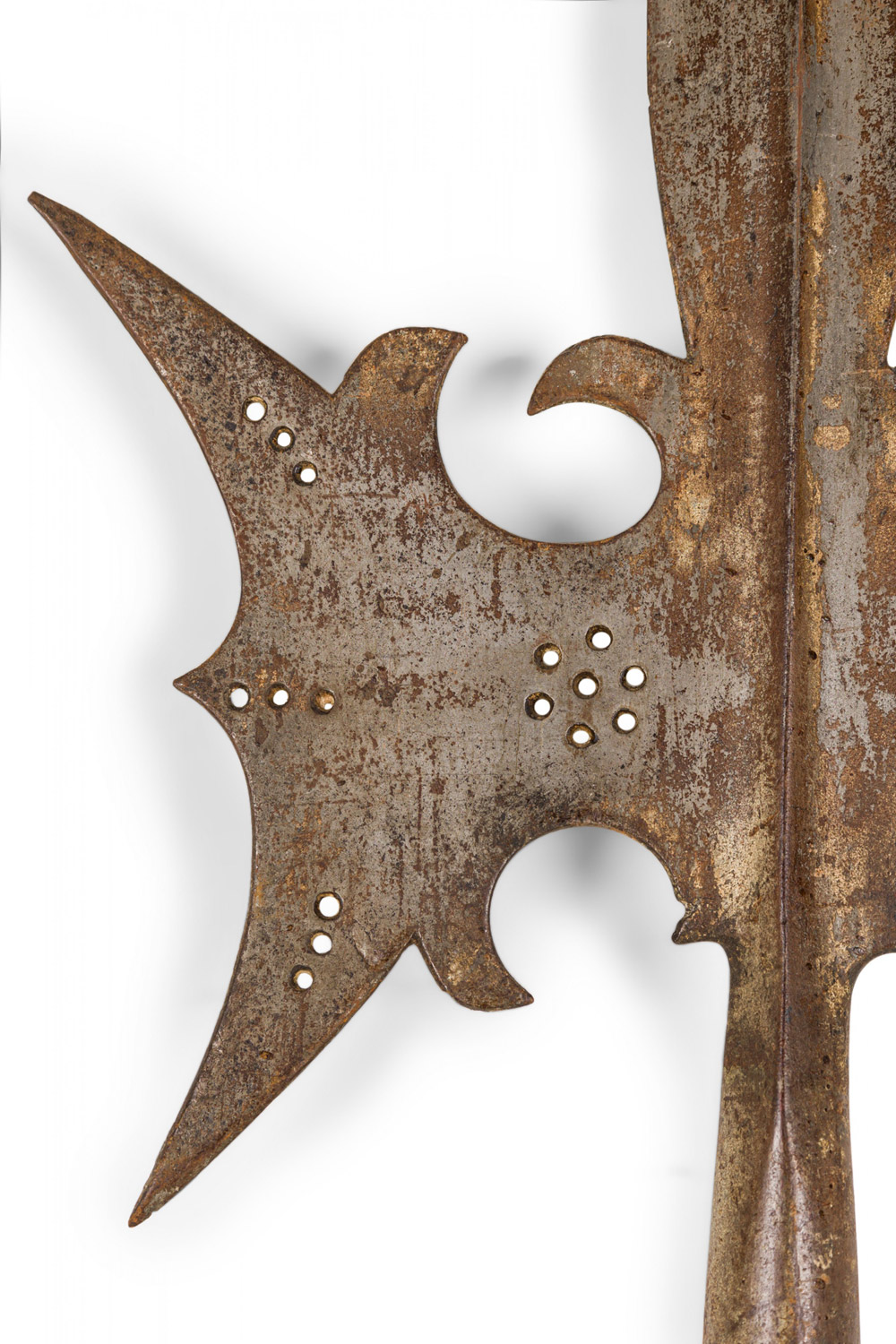 English Renaissance-style halberd spear with eight-sided wooden shaft with nail heads and an iron ax-shaped blade.