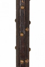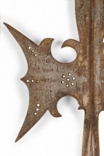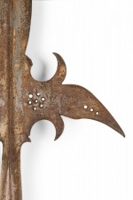 English Renaissance-style halberd spear with eight-sided wooden shaft with nail heads and an iron ax-shaped blade..