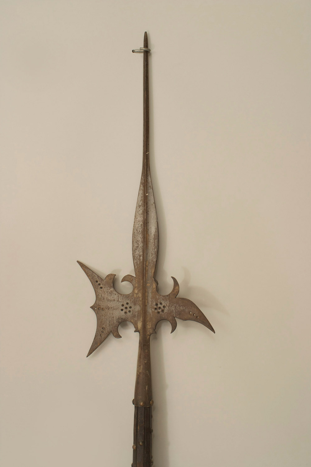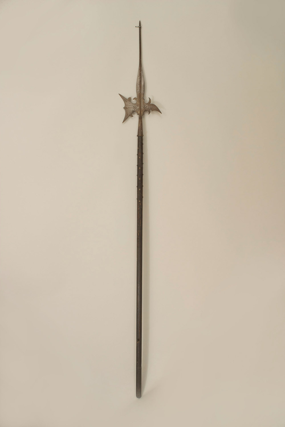 English Renaissance-style halberd spear with eight sided wooden shaft with nail heads and 52½-inch iron open design ax blade..
