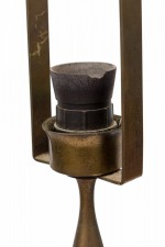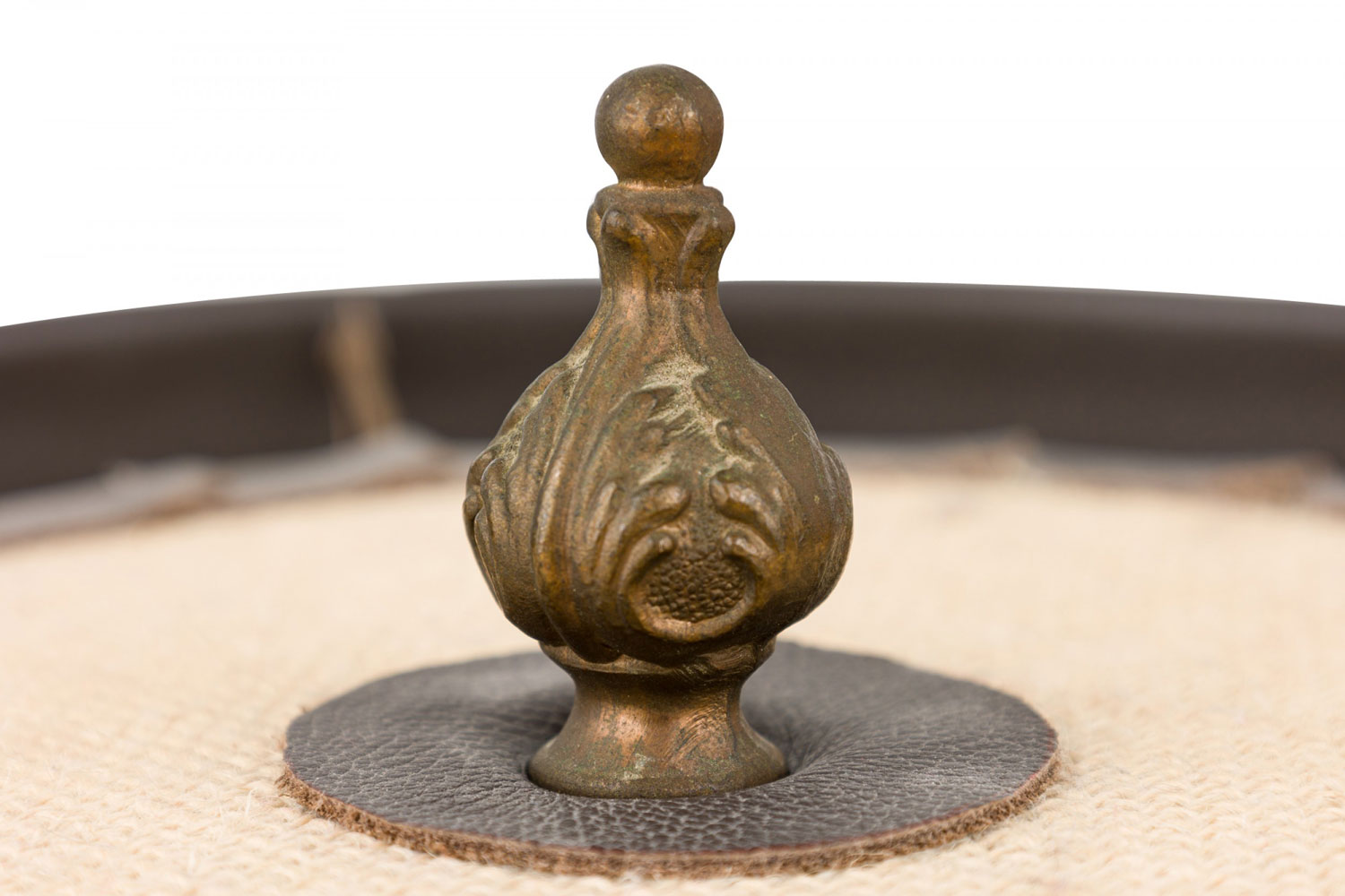 Style: English Materials & Techniques: Brass, fabric, leather, metal Category: Lighting Condition: Ships with shade. Good; Wear consistent with age and use