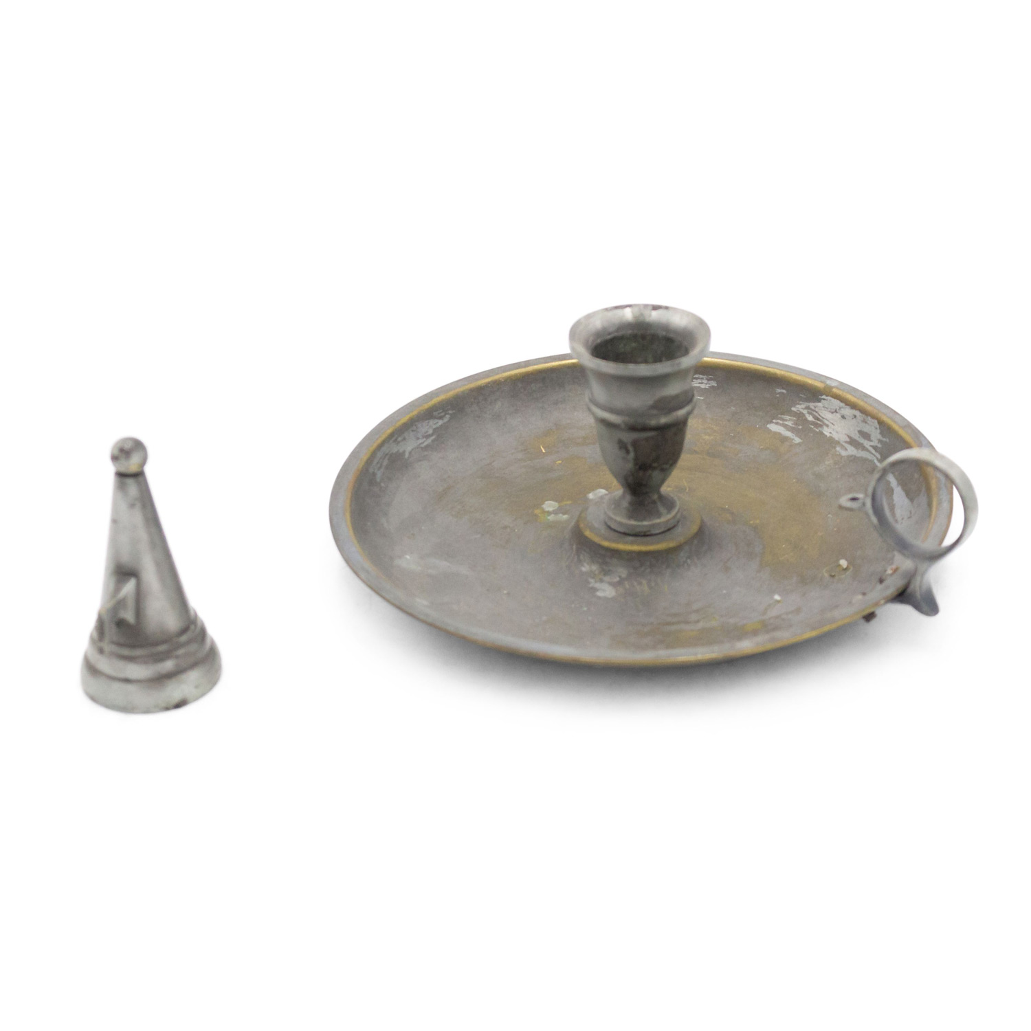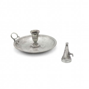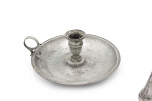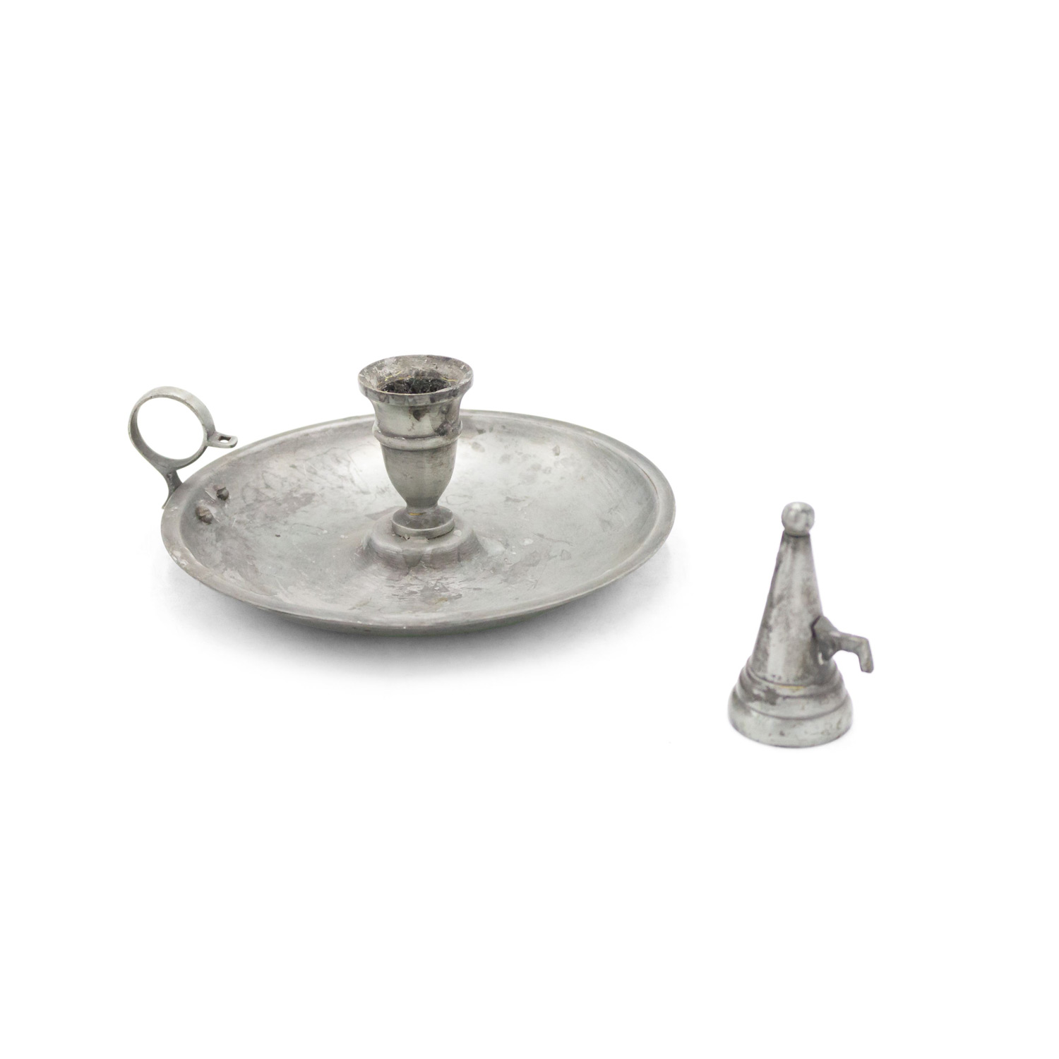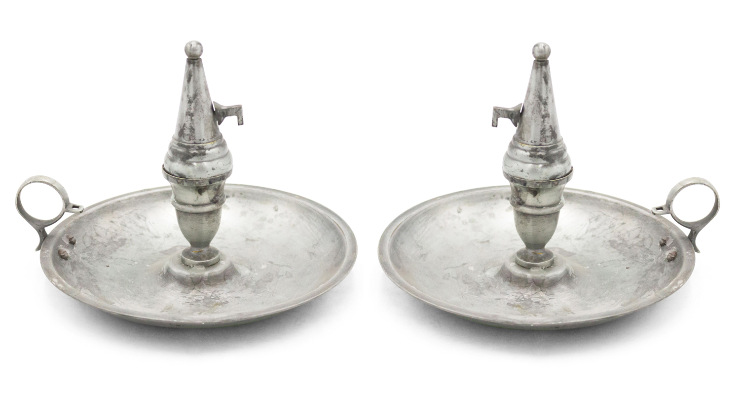 3 English Renaissance-style (20th Century) round pewter candlesticks with snuffer (PRICED EACH).