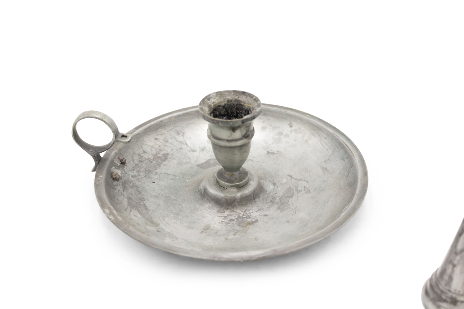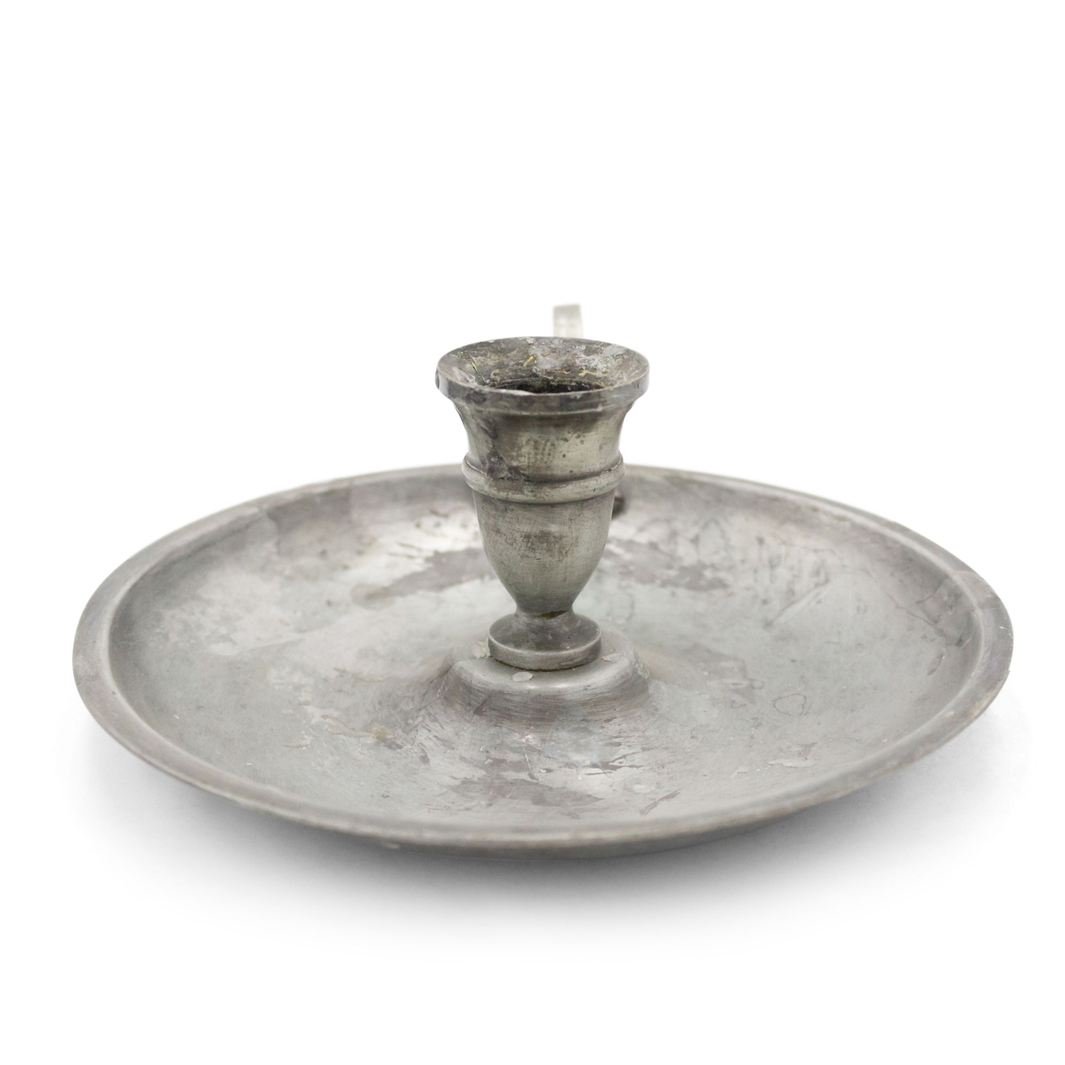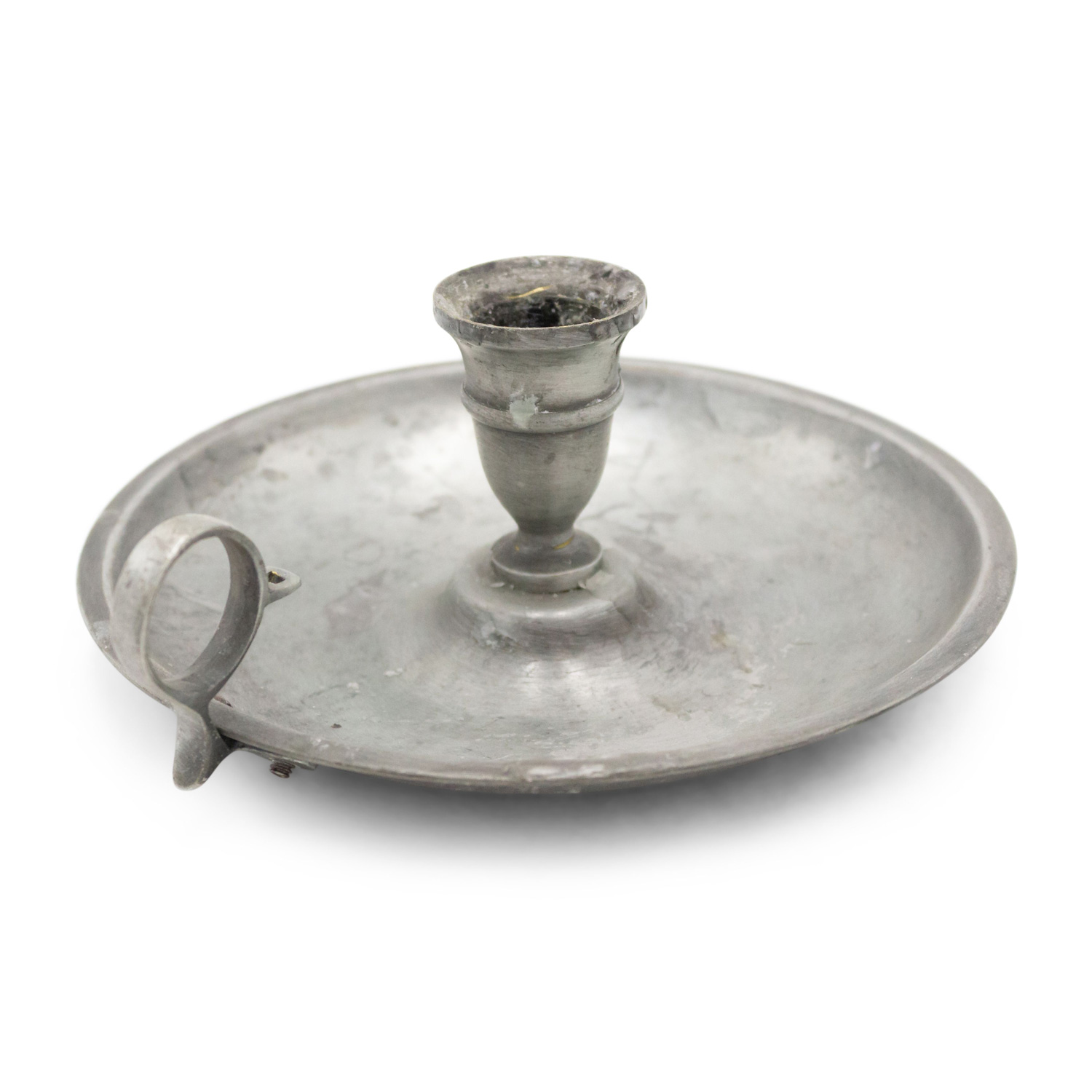 3 English Renaissance-style (20th Century) round pewter candlesticks with snuffer (PRICED EACH).