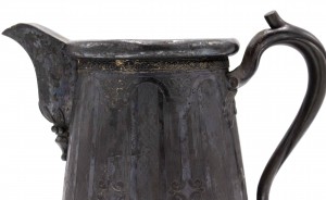 English Renaissance-style (19th Century) large pewter pitcher with etched scroll design