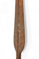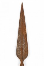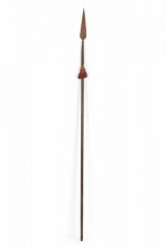 English Renaissance-style spear with wood shaft and etched iron blade with tassel..